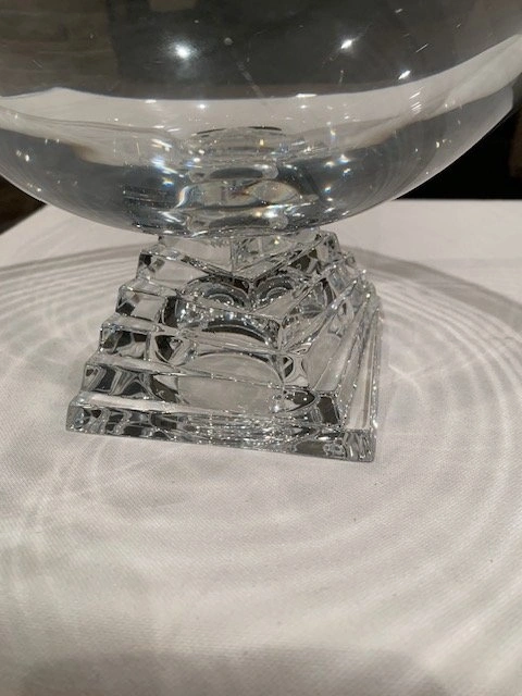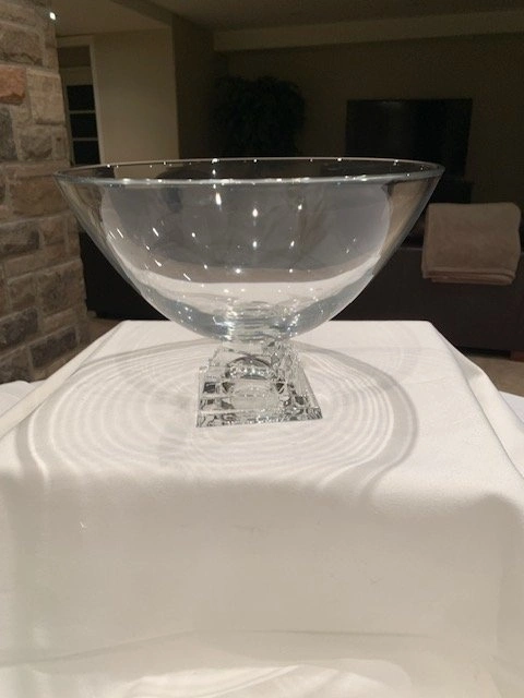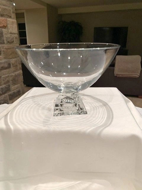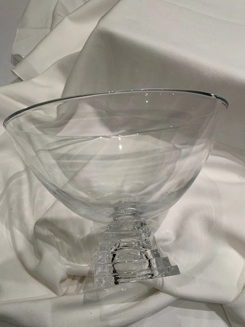 Vintage JG Durand Cristal pedestal bowl with a stacked square base. Made of clear crystal and manufactured in France. The design is modernist with a distinctive geometric base. Can be used as a fruit bowl, serving bowl, or decorative centerpiece. Measures 11" wide and 8" high. Mint condition, no chips or cracks. From a smoke-free, pet-free home. Located in Richmond Hill (Bathurst and King Rd).