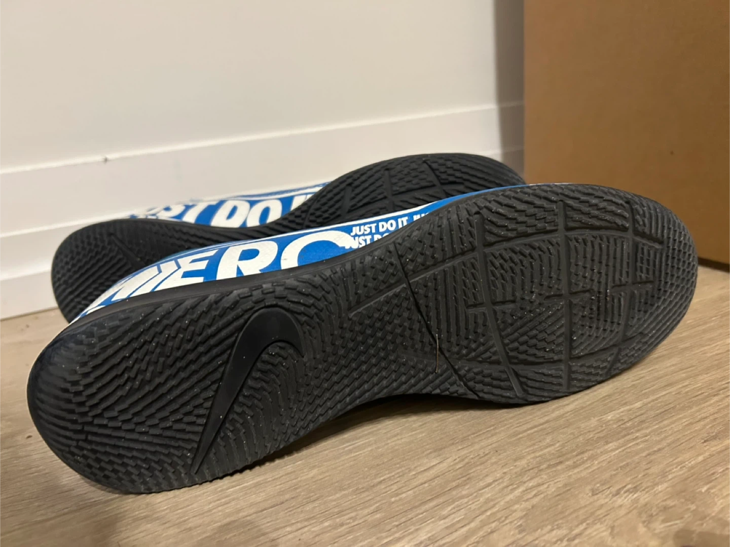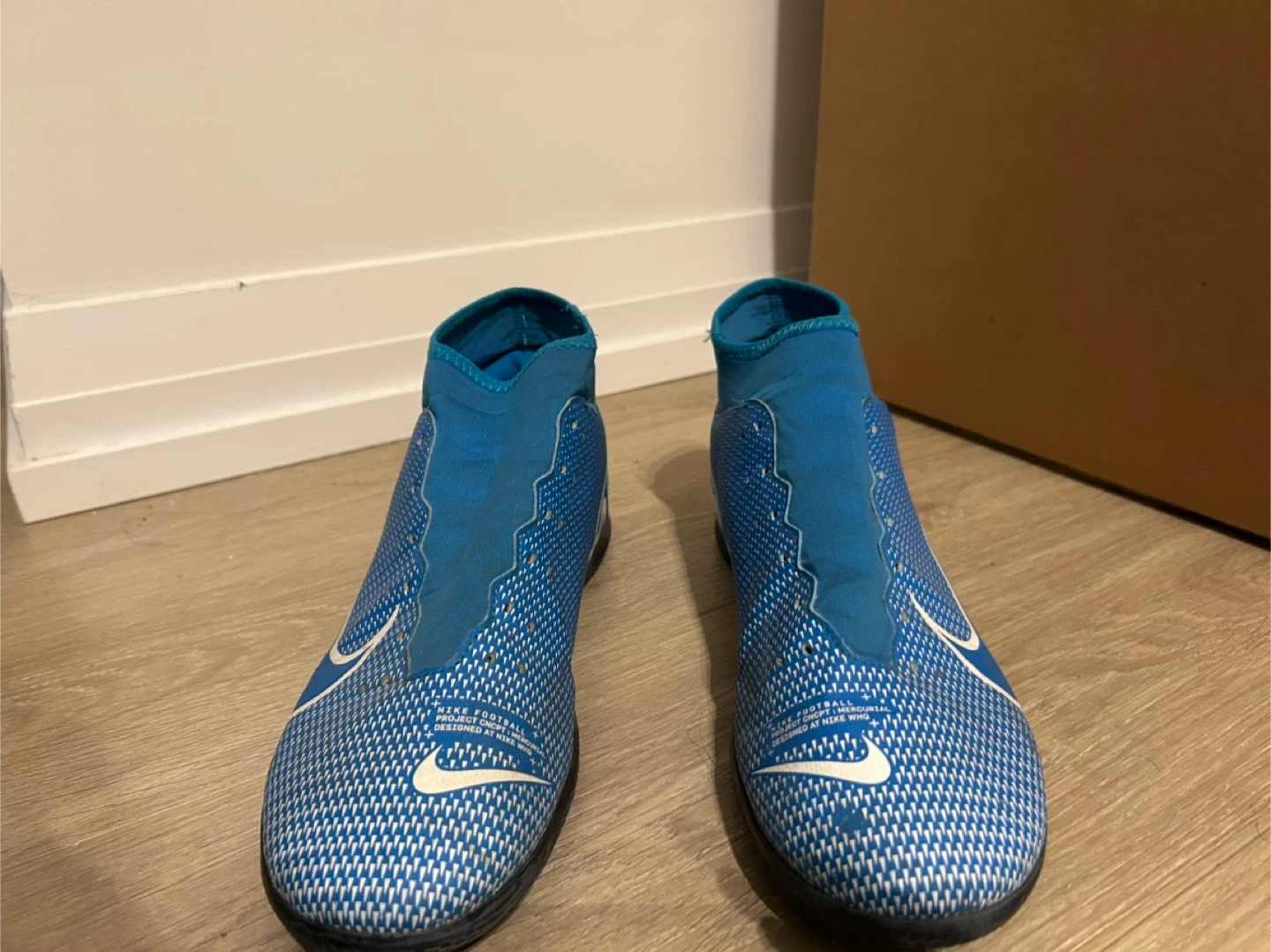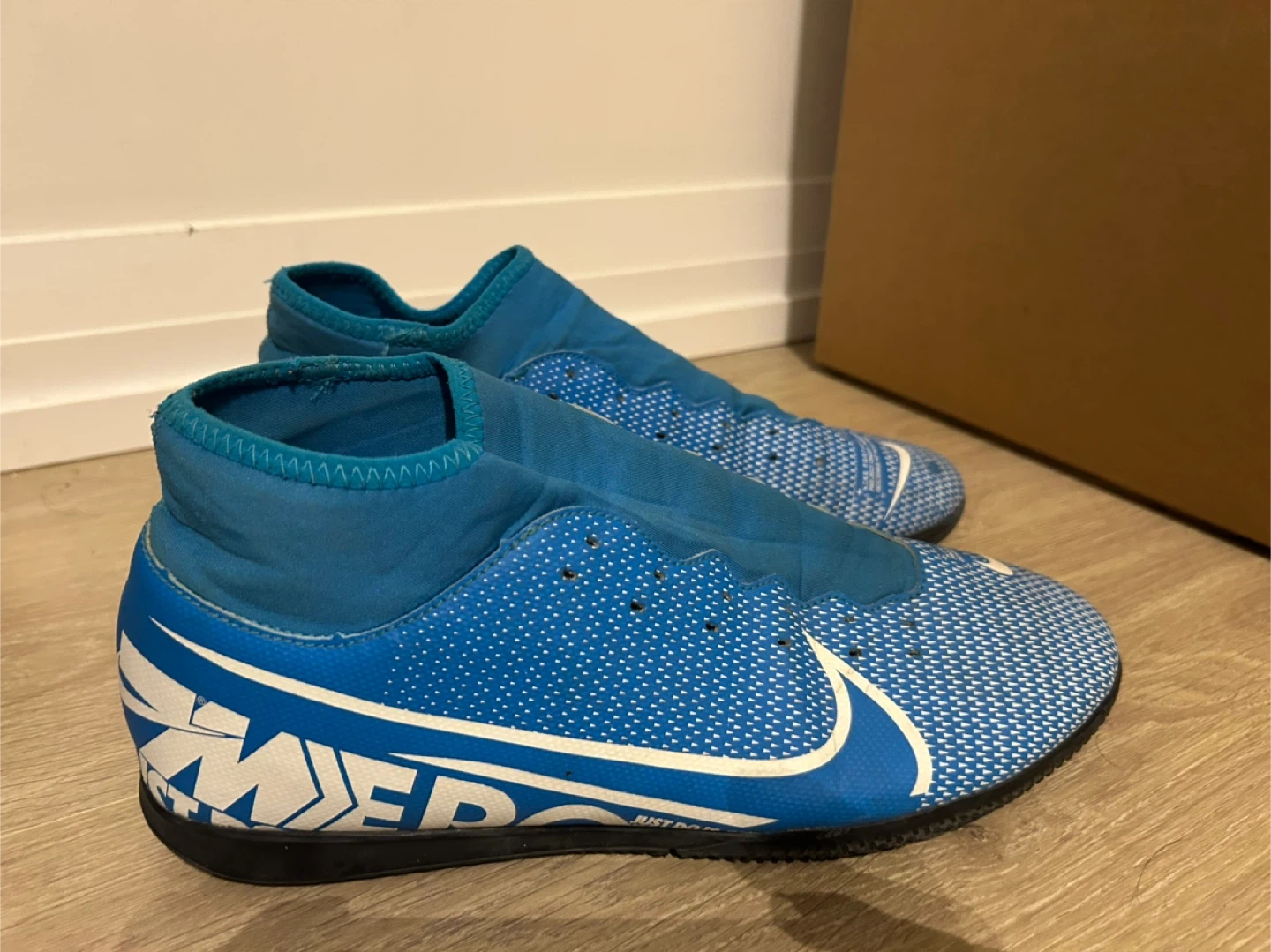 These are blue and white Nike Mercurial indoor soccer shoes. They feature a synthetic upper and a rubber outsole for traction. The sock-like collar offers a snug fit.