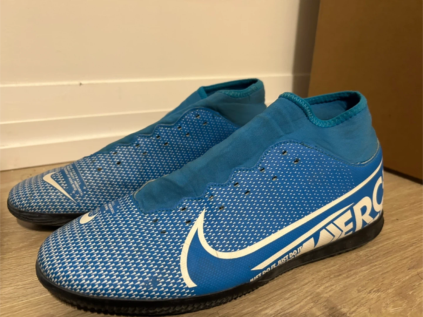 These are blue and white Nike Mercurial indoor soccer shoes. They feature a synthetic upper and a rubber outsole for traction. The sock-like collar offers a snug fit.