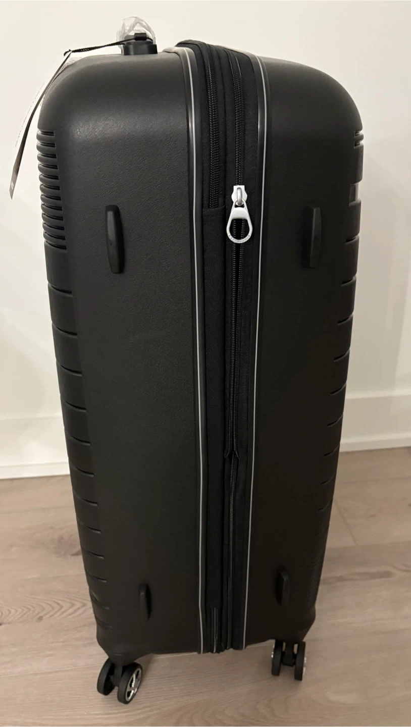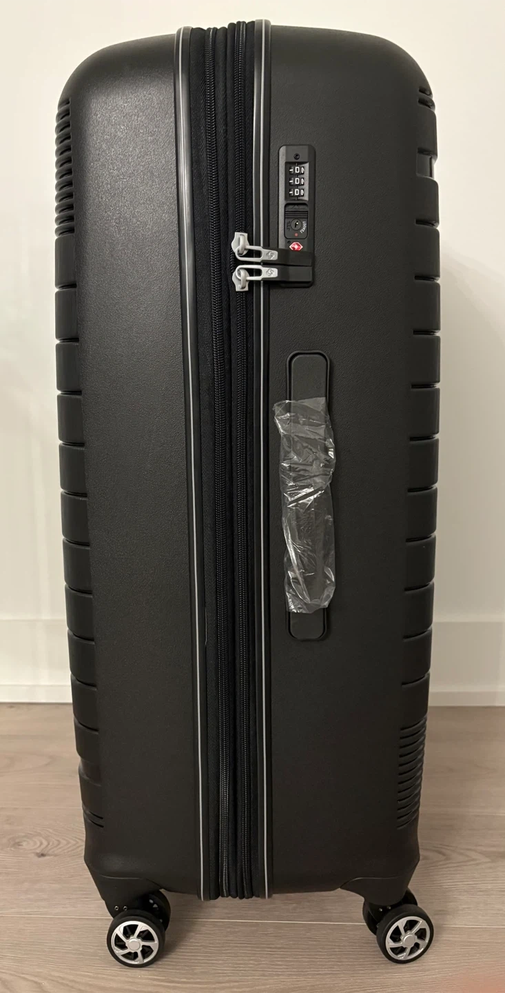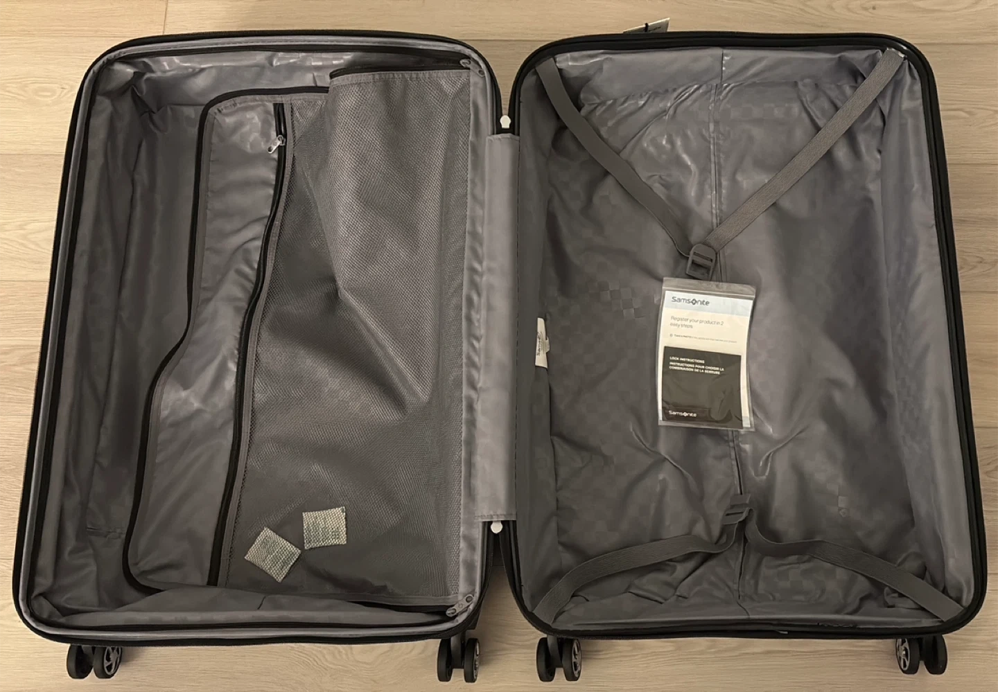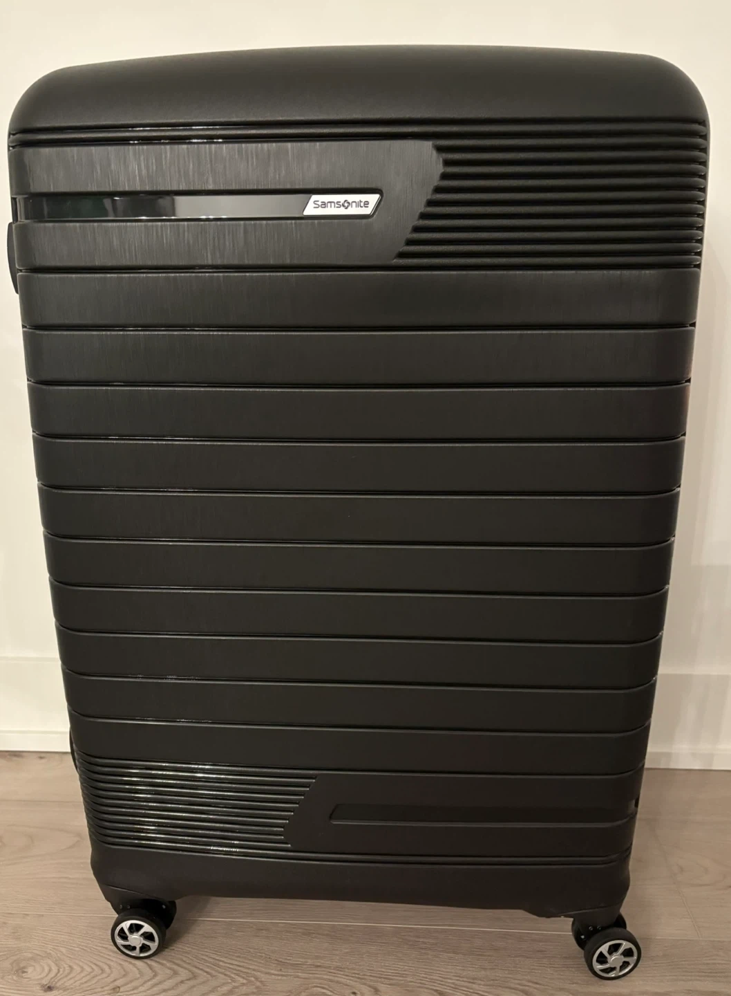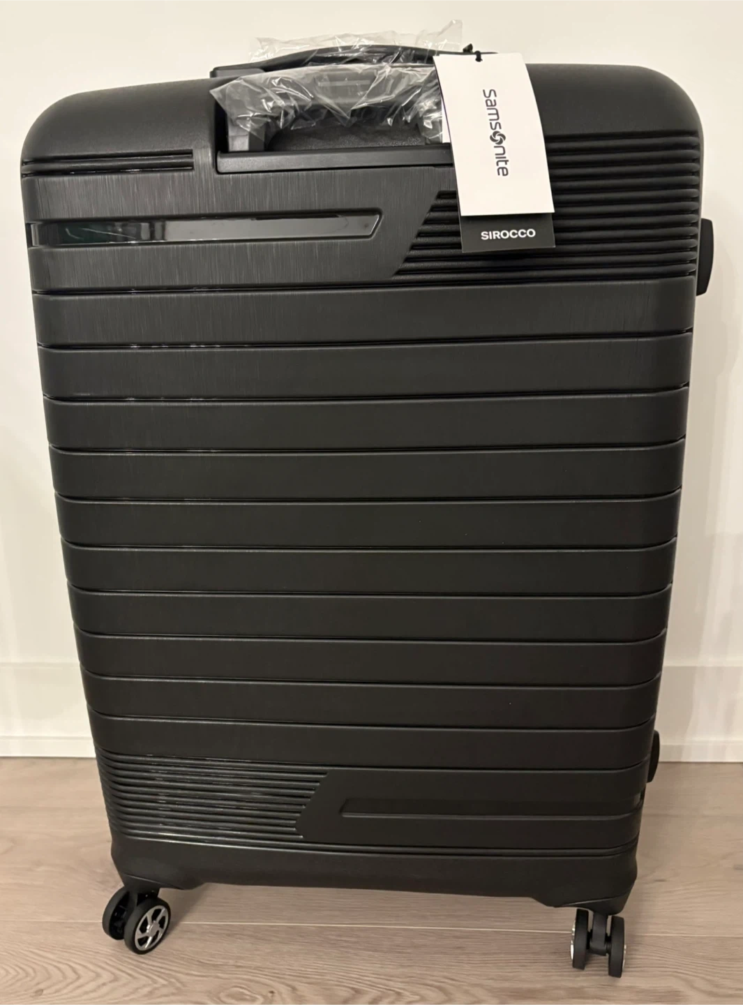 Samsonite Sirocco hardside spinner luggage in black. It's a carry-on size suitcase with a durable shell and TSA lock. Includes interior packing straps and zippered compartments.