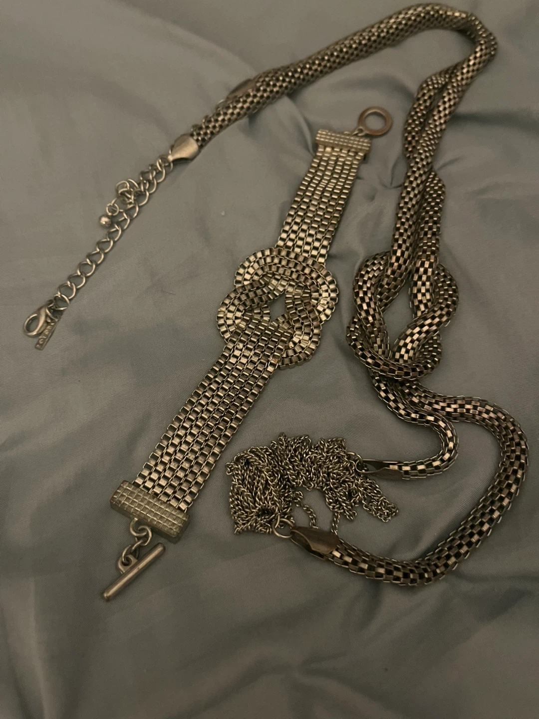 Stylish silver mesh chain necklaces with a unique knot detail and decorative tassels. It features a toggle clasp and an extender chain for adjustable fit. This belt adds a touch of elegance to any outfit!