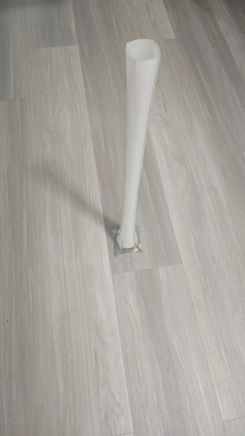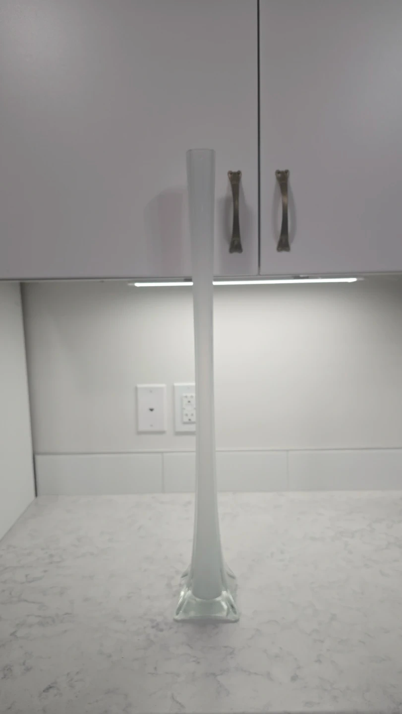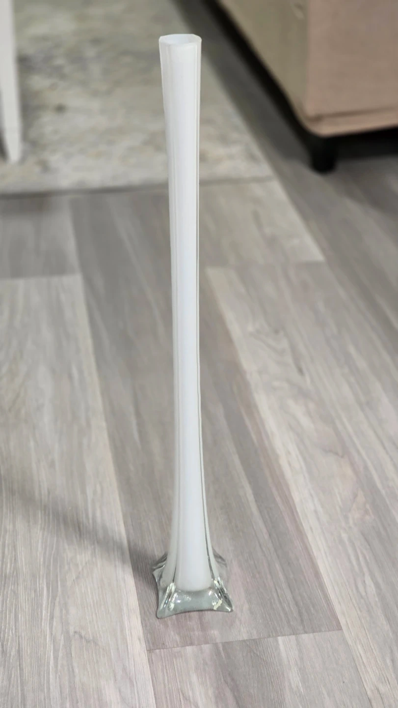 This is a beautiful tall bud vase with a frosted white glass finish. It has a flared square base and a slim, trumpet-shaped opening. Its height makes it a striking decorative piece for any room. Perfect for displaying single stems or small floral arrangements!