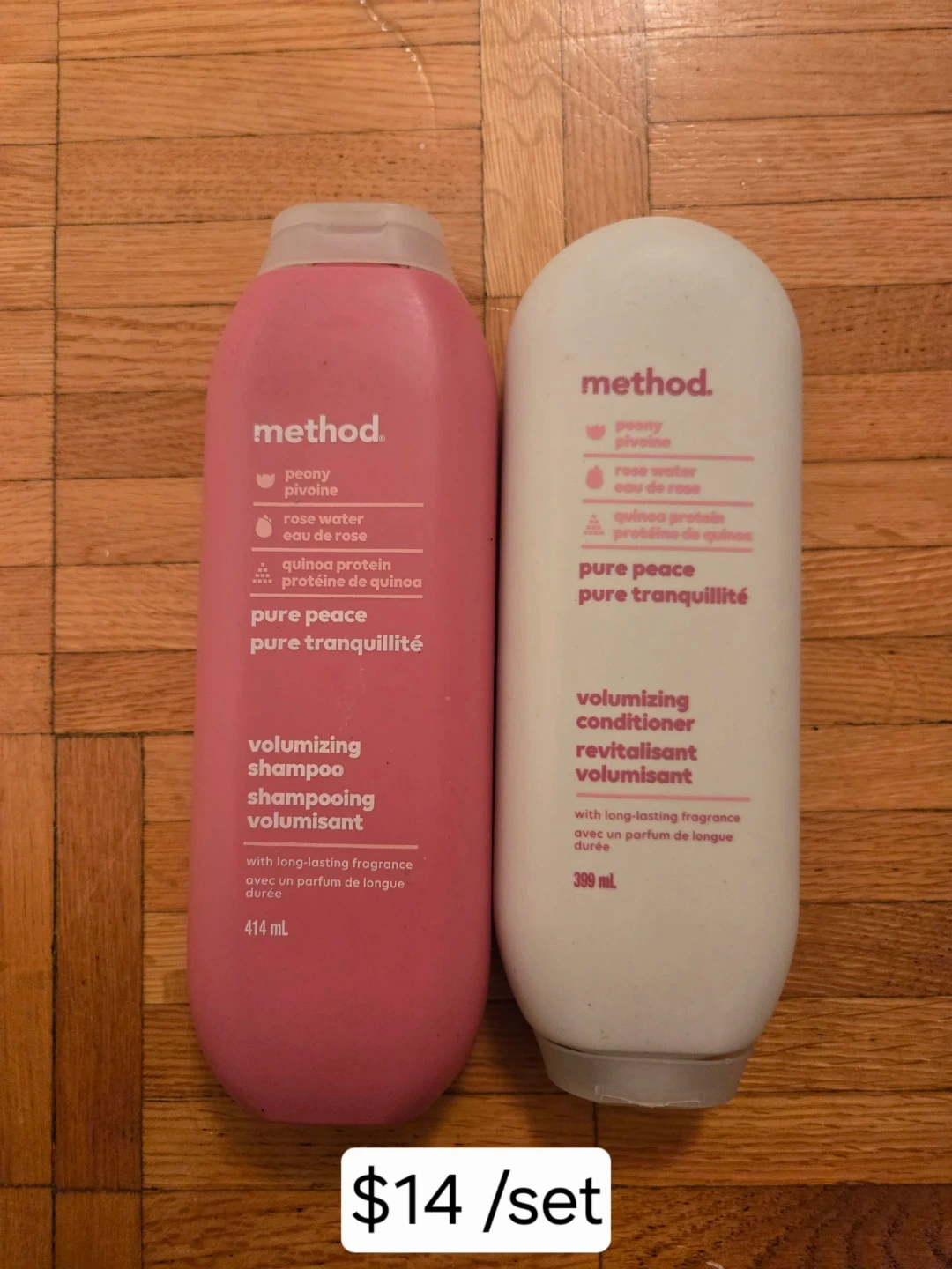 This set includes Method's volumizing shampoo and conditioner in the Peony & Rose Water scent. It's formulated with quinoa protein for pure peace and pure tranquility. The shampoo is 414 mL and the conditioner is 399 mL.