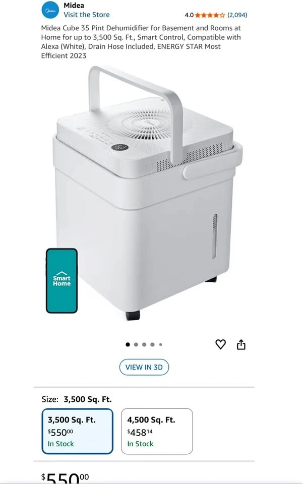 Brand new sealed Midea Cube 35 Pint Dehumidifier, designed for rooms and basements up to 3,500 sq. ft. Ideal for controlling humidity in large spaces. Features Smart Control and Alexa compatibility, and is ENERGY STAR Most Efficient 2023. It has a 35 pint capacity for strong moisture removal and includes a drain hose for easy continuous drainage. The compact cube design makes it convenient for storage and portability. Suitable for basements, homes, apartments, and larger rooms. Feel free to message if you have any questions!