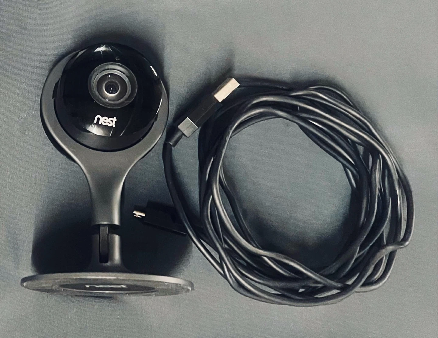 This is a Nest Cam indoor security camera. It comes with a black power cable. This camera is great for keeping an eye on your home!
