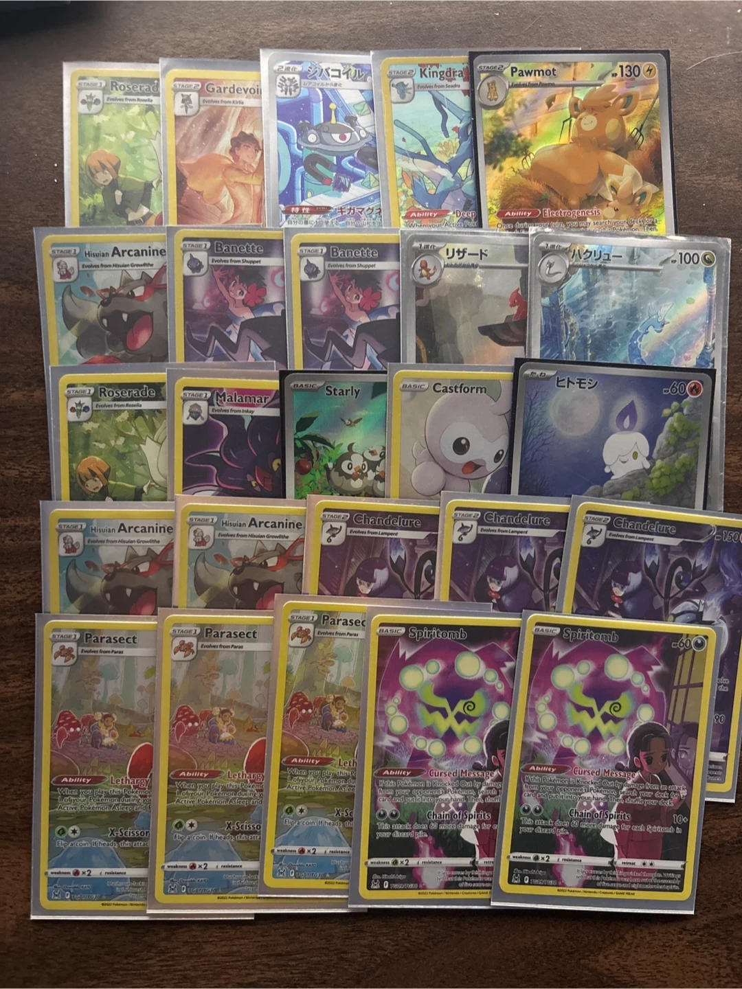Collection of various Pokémon trading cards including Pawmot, Chandelure, and Spiritomb. Some cards feature multiple copies and different stages of evolution. All cards appear to be in protective sleeves.