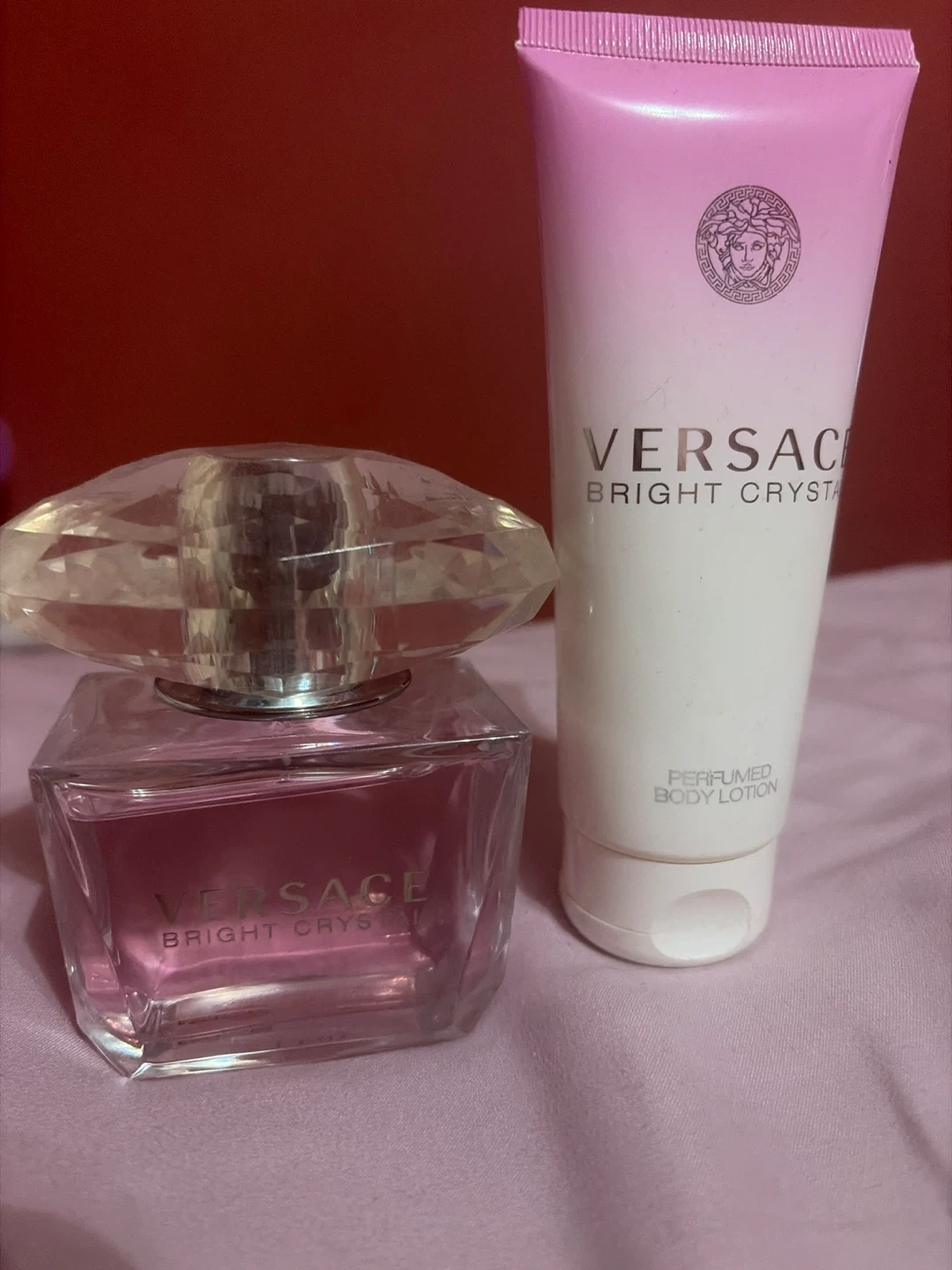 This is a Versace Bright Crystal perfume and perfumed body lotion set. The perfume bottle has a distinctive crystal cap. The body lotion tube is pink and white.