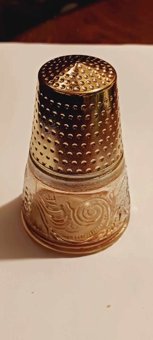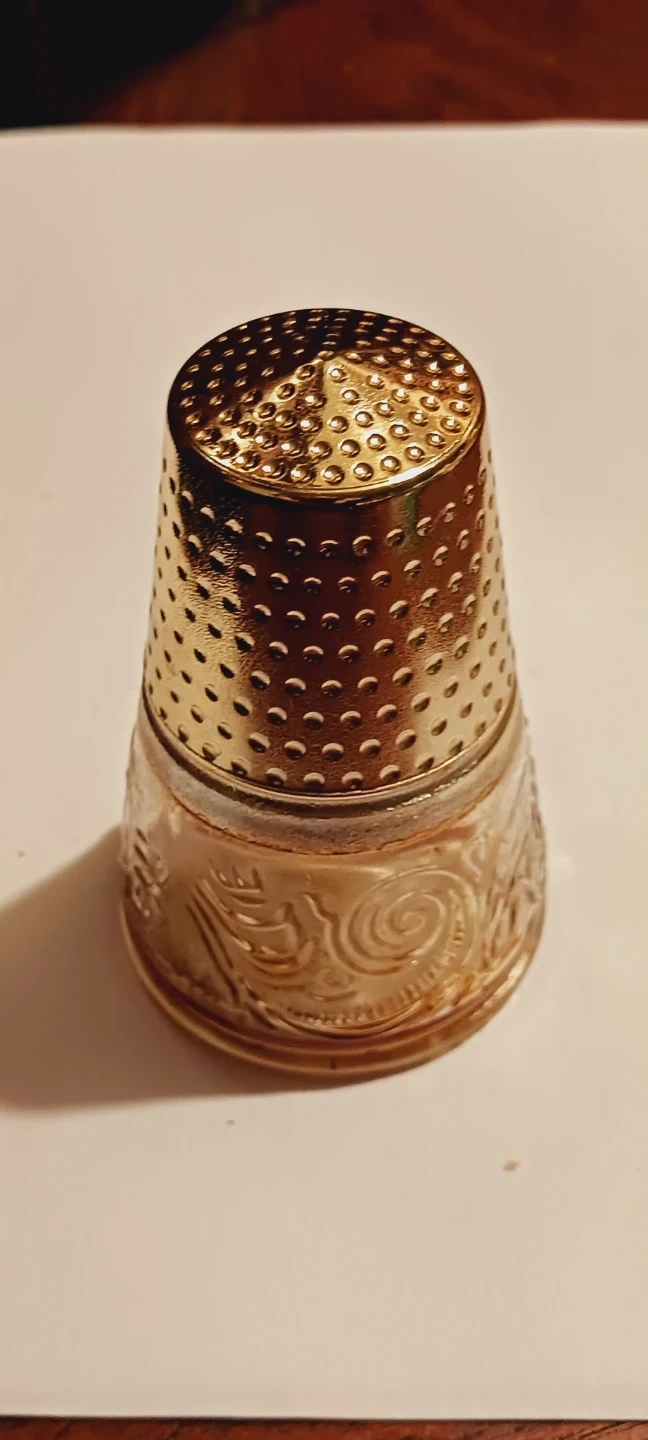 Collectible Vintage Empty Avon Perfume bottle shaped as a thimble with a gold-tone textured metal top and a clear glass base. The glass features an embossed floral pattern. It's designed for sewing and protecting fingers, cute perfume bottle. It's empty !!