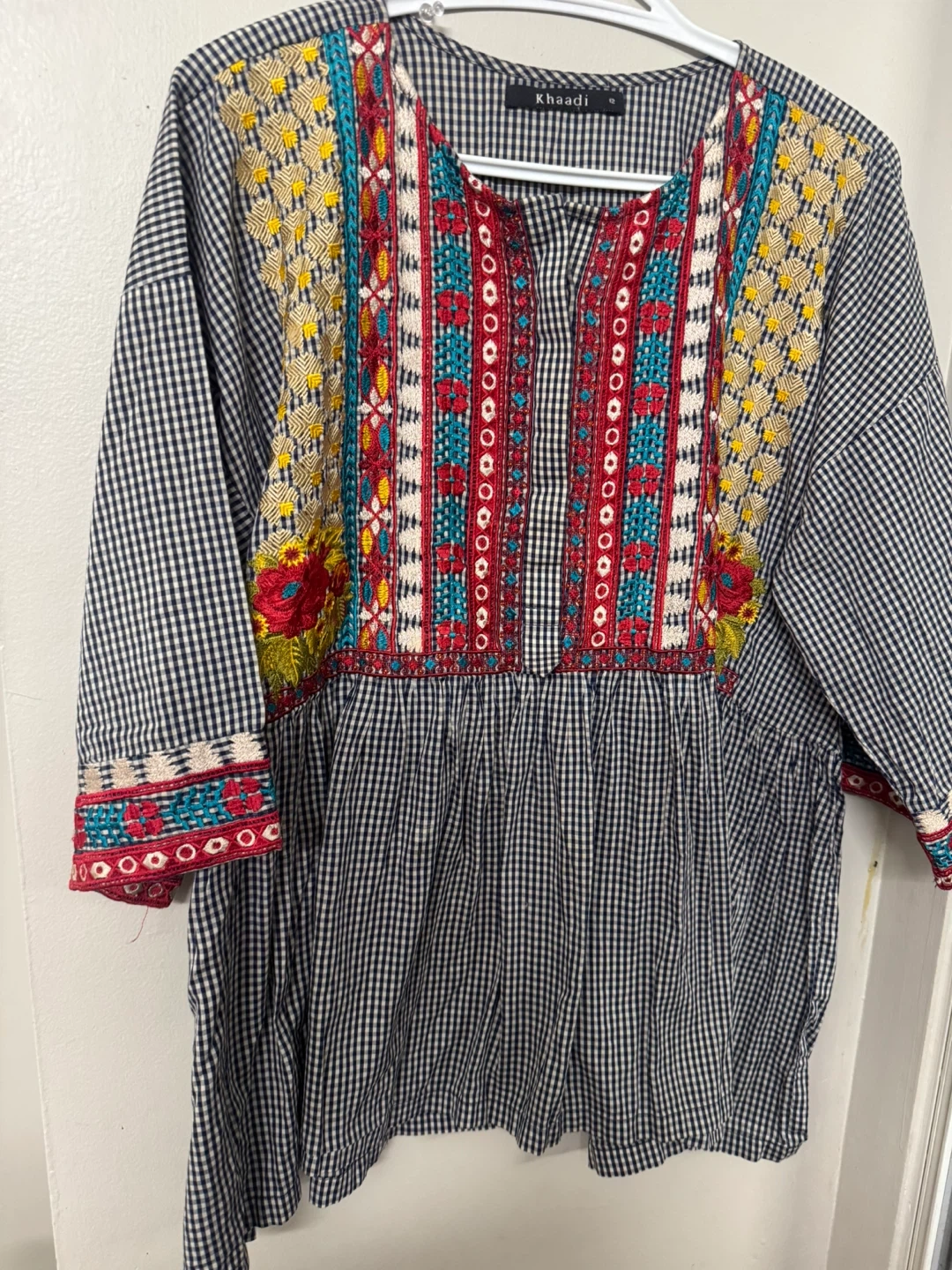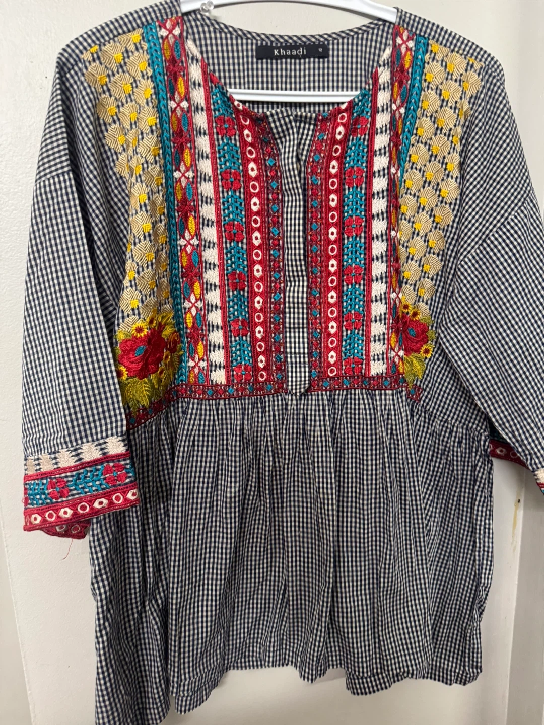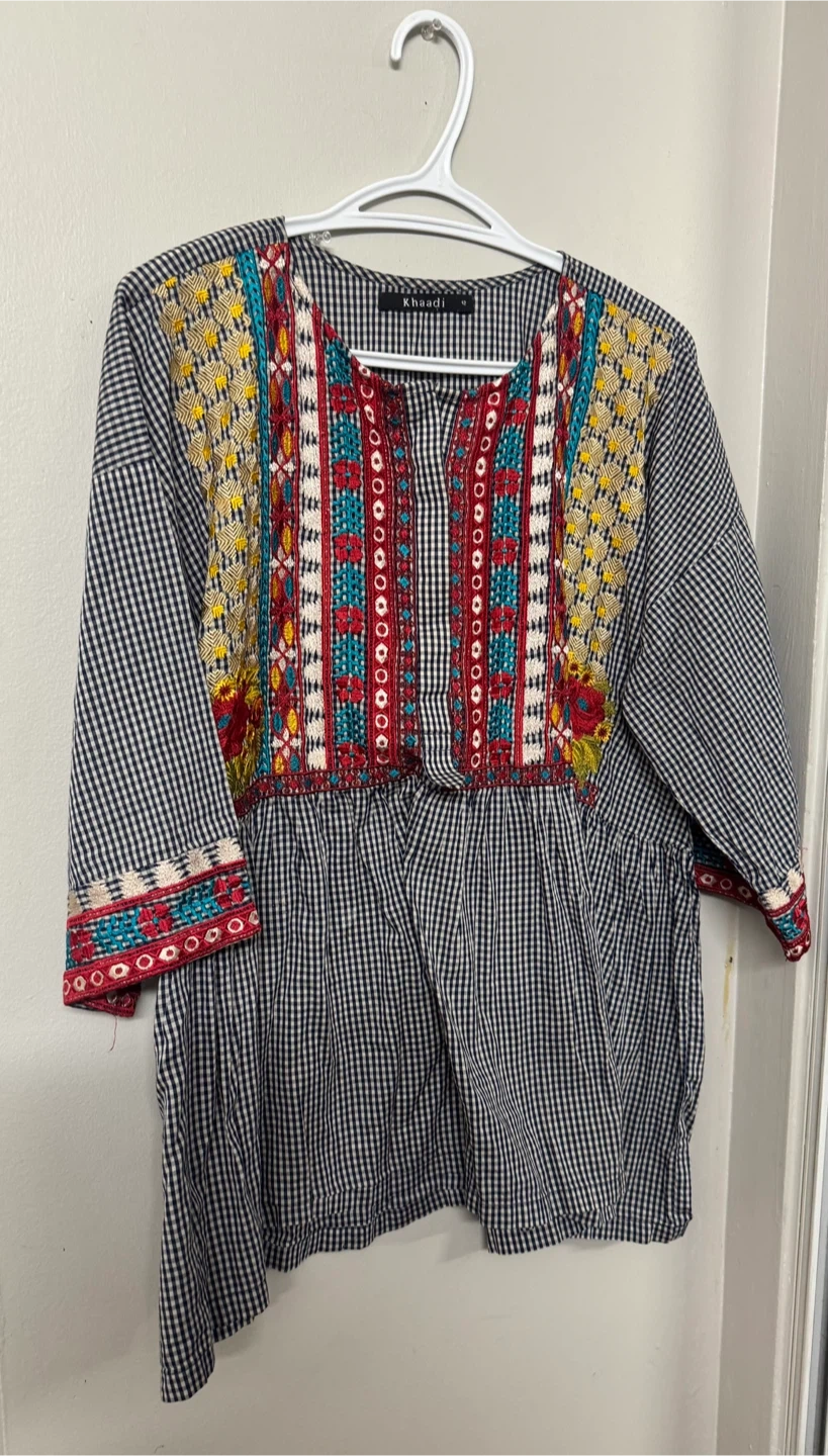 This Khaadi tunic features a black and white gingham pattern with vibrant embroidered detailing on the bodice and sleeves. It's a size 12 with a flattering empire waist silhouette. This piece is perfect for adding a pop of colour to your casual wardrobe!