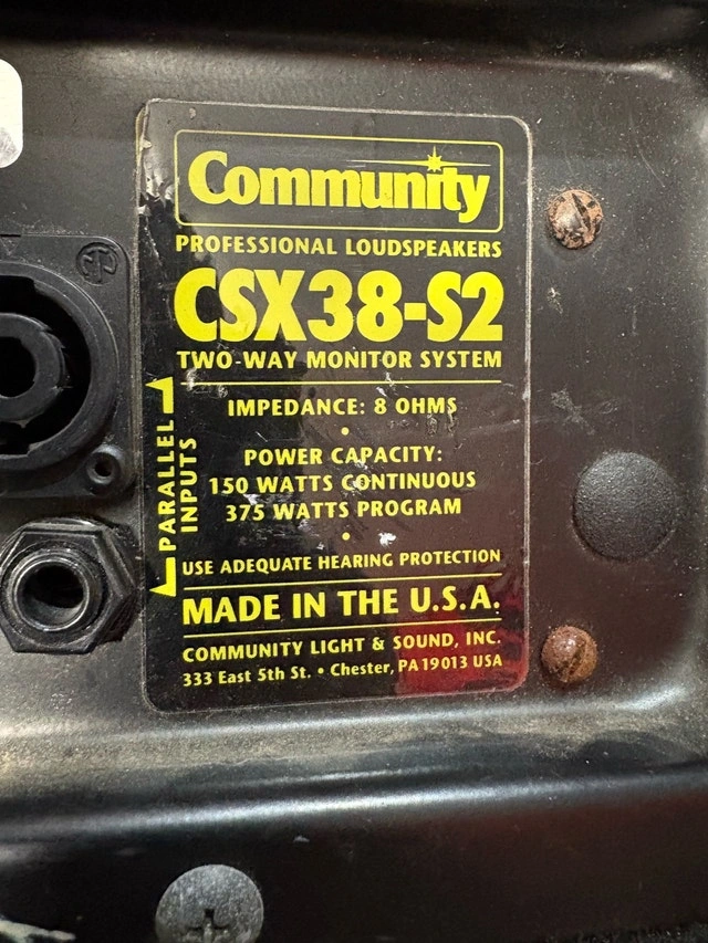 This Community CSX38-S2 two-way monitor system delivers 150 watts continuous and 375 watts program at 8 ohms, perfect for professional audio setups. This speaker is in used condition, showing some wear and tear as pictured, but it functions perfectly and is ready to amplify your sound. Here are some specifications: Type: Two-Way Monitor System, Impedance: 8 Ohms, Continuous Power: 150 Watts, Program Power: 375 Watts, Made in: USA. This speaker is still available if the ad is up, ready to bring the noise to its new home! Cash accepted.