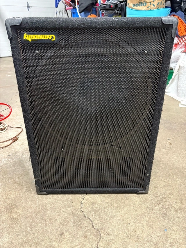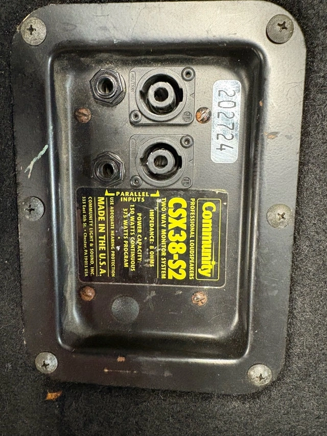 This Community CSX38-S2 two-way monitor system delivers 150 watts continuous and 375 watts program at 8 ohms, perfect for professional audio setups. This speaker is in used condition, showing some wear and tear as pictured, but it functions perfectly and is ready to amplify your sound. Here are some specifications: Type: Two-Way Monitor System, Impedance: 8 Ohms, Continuous Power: 150 Watts, Program Power: 375 Watts, Made in: USA. This speaker is still available if the ad is up, ready to bring the noise to its new home! Cash accepted.
