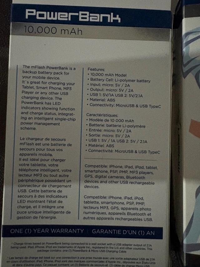 Selling a new mFlash 10,000 mAh power bank. It's great for charging devices on the go and has LED indicators for charge status. Still in original packaging. Features: Li-polymer battery, MicroUSB & USB Type-C connectivity. Input: micro: 5V / 2A. Output: micro: 5V / 2A, USB 1: 5V/1A, USB 2: 5V/2.1A. Material: ABS.