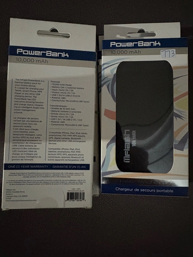 Selling a new mFlash 10,000 mAh power bank. It's great for charging devices on the go and has LED indicators for charge status. Still in original packaging. Features: Li-polymer battery, MicroUSB & USB Type-C connectivity. Input: micro: 5V / 2A. Output: micro: 5V / 2A, USB 1: 5V/1A, USB 2: 5V/2.1A. Material: ABS.