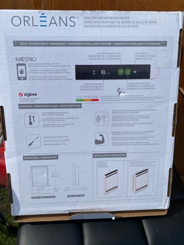 240v. The quietest fan heater in its category. Optimal heat and comfort when you need it. Robust, durable, and rust-resistant. Brand new in box. With thermostat.
