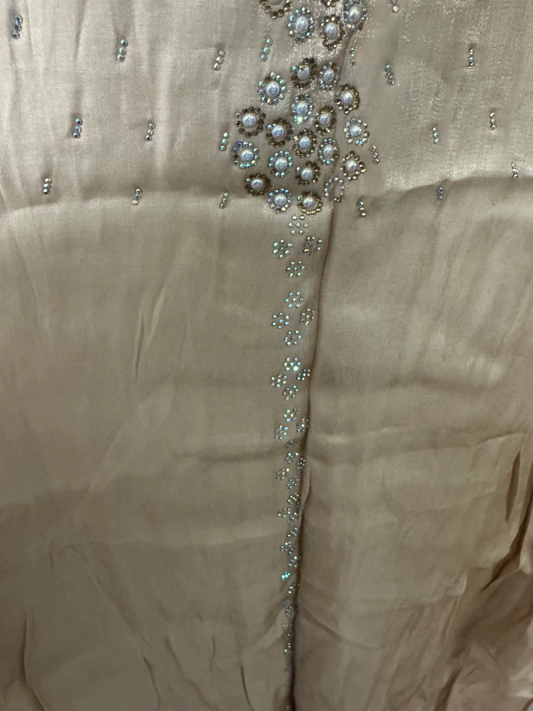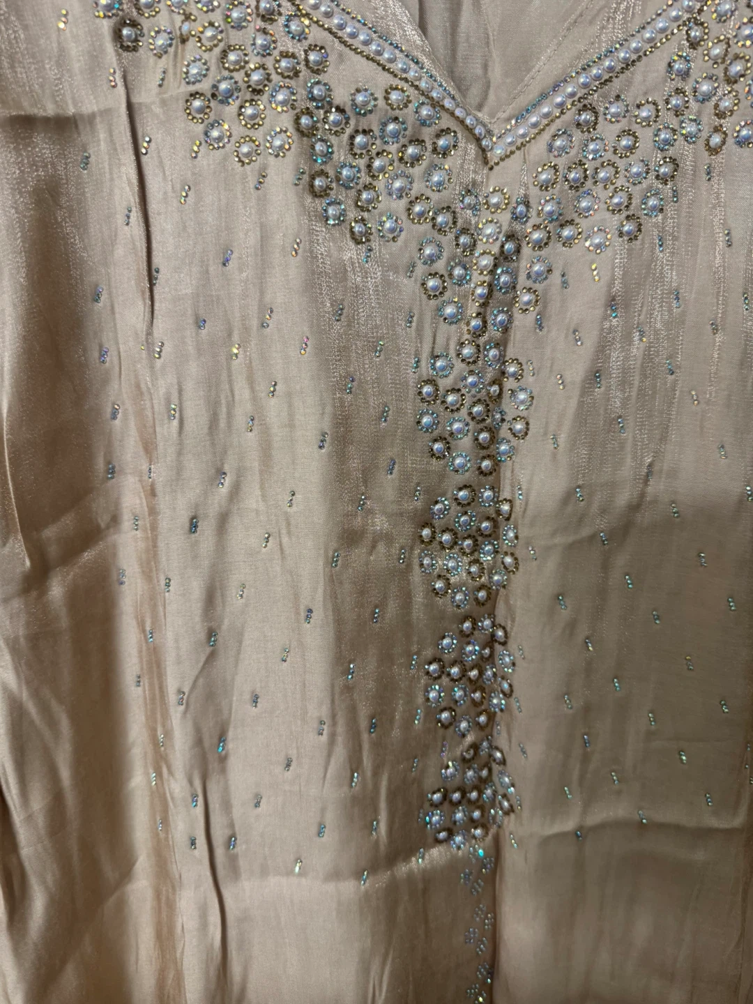 This beige kaftan features a shimmering fabric with intricate bead and rhinestone embellishments around the neckline and down the front. It has a V-neckline and 3/4 sleeves. Perfect for special occasions!