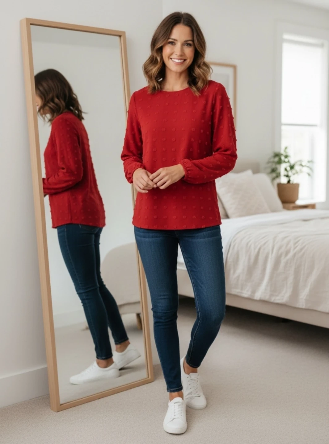 This red long sleeve top features a textured dobby dot design throughout. It has a crew neckline and long sleeves. Material appears to be a polyester blend.