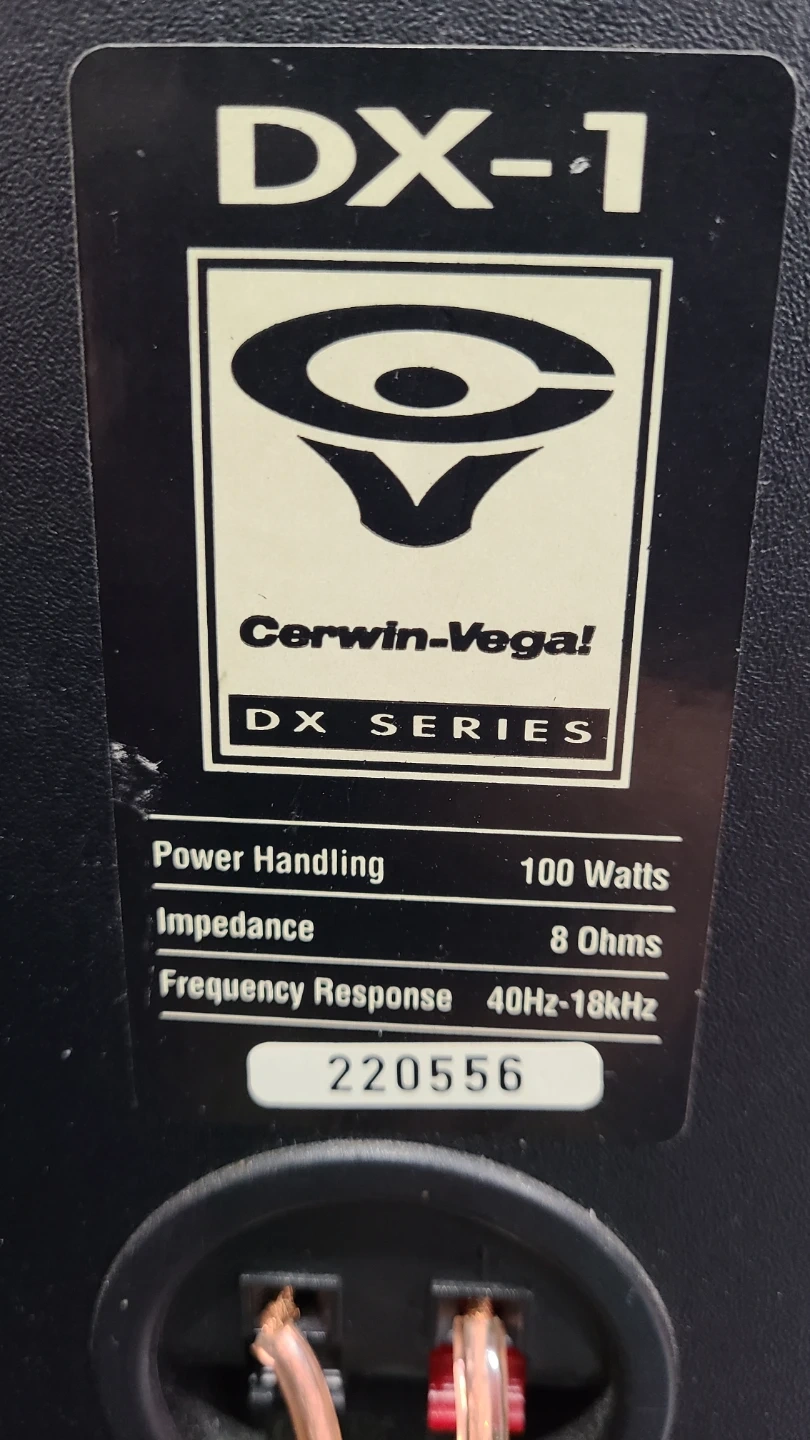 Pair of Cerwin-Vega DX-1 speakers from the DX Series. Power handling is 100 Watts with an impedance of 8 Ohms. Frequency response is 40Hz-18kHz.