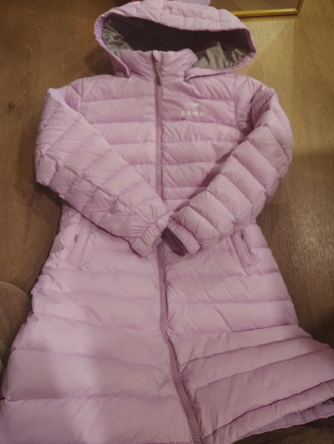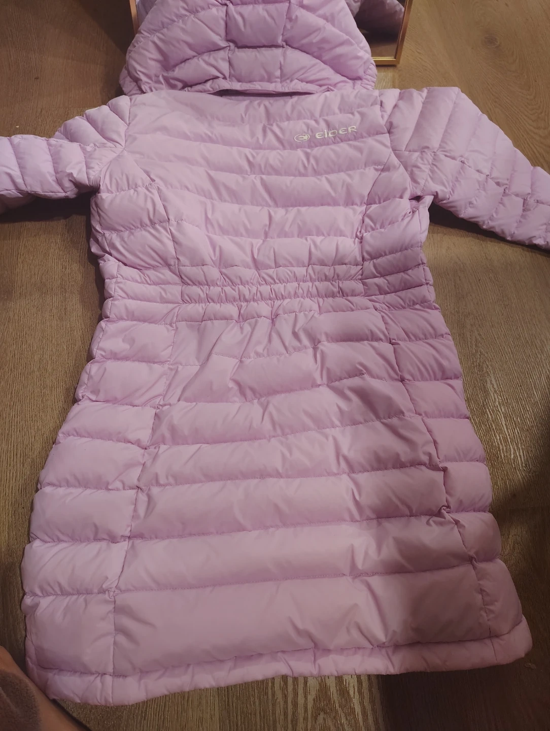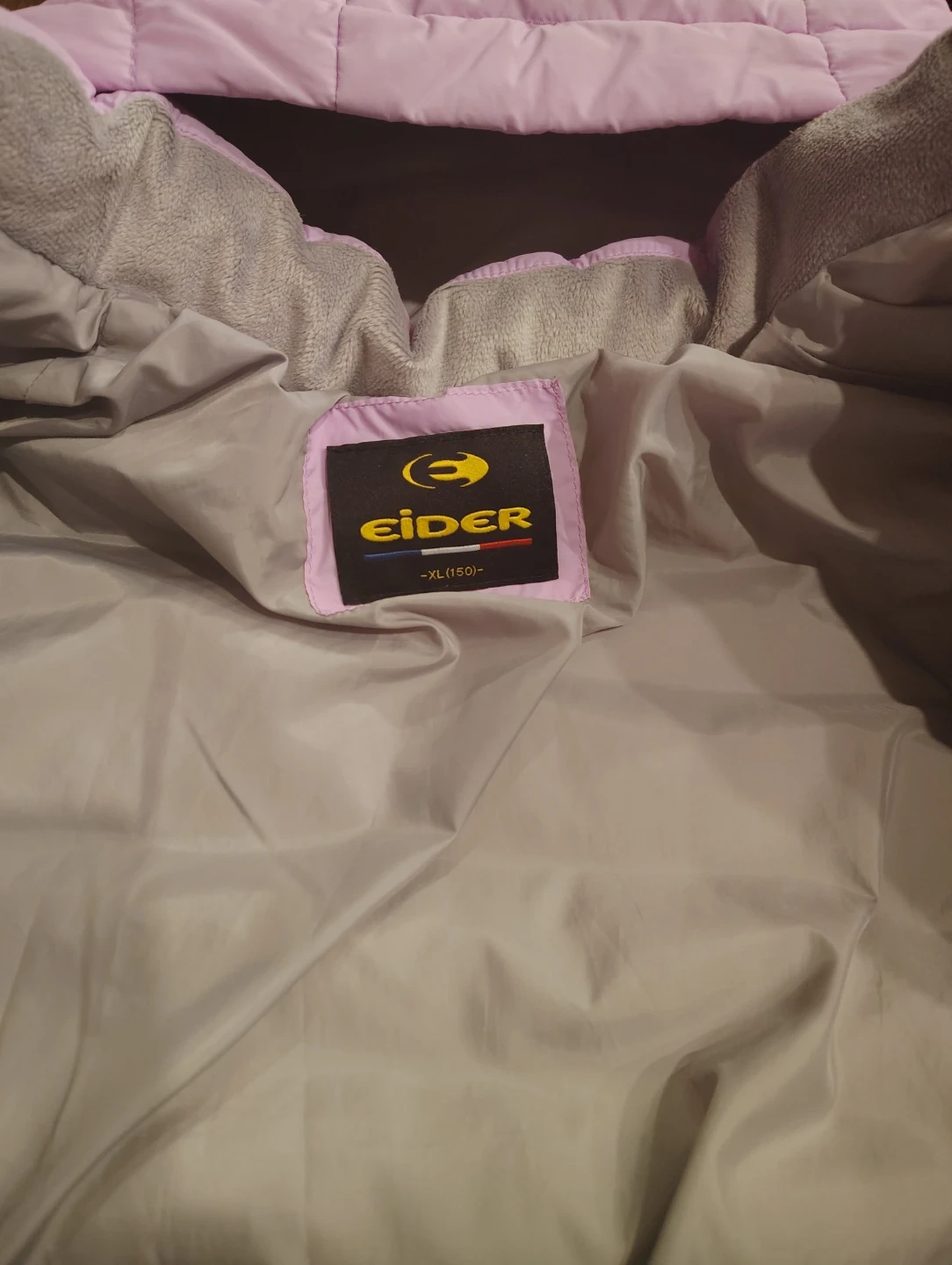 This is an Eider pink puffer coat. It's a size XL, which corresponds to 150cm for ages 12-13 years. The outer shell is made of 100% nylon, with 100% polyester filling and 80% down and 20% feather insulation. It has a comfortable grey lining and a hood for extra warmth.