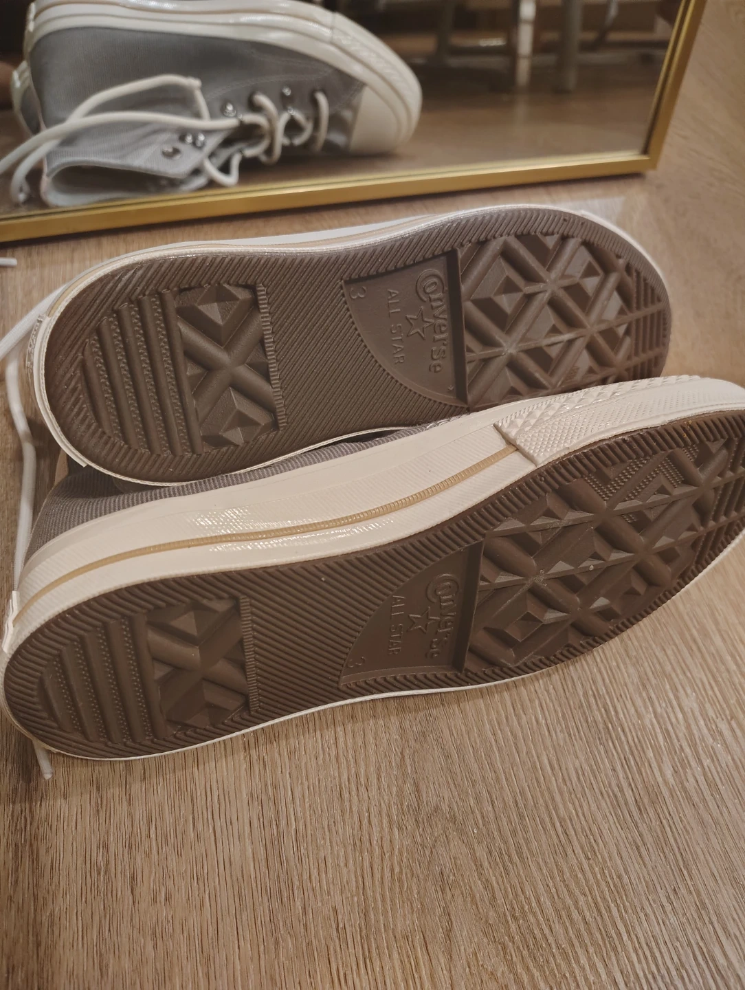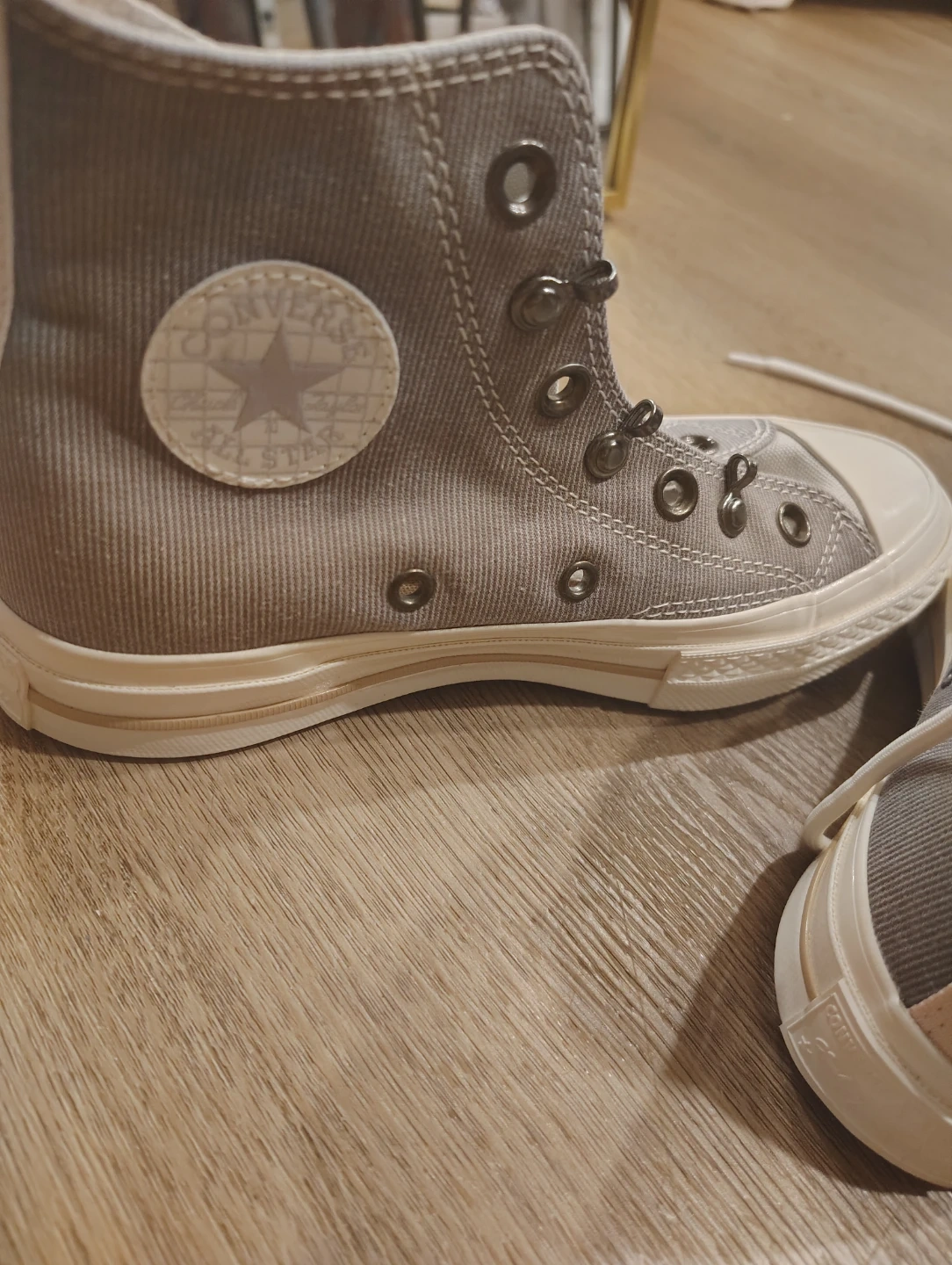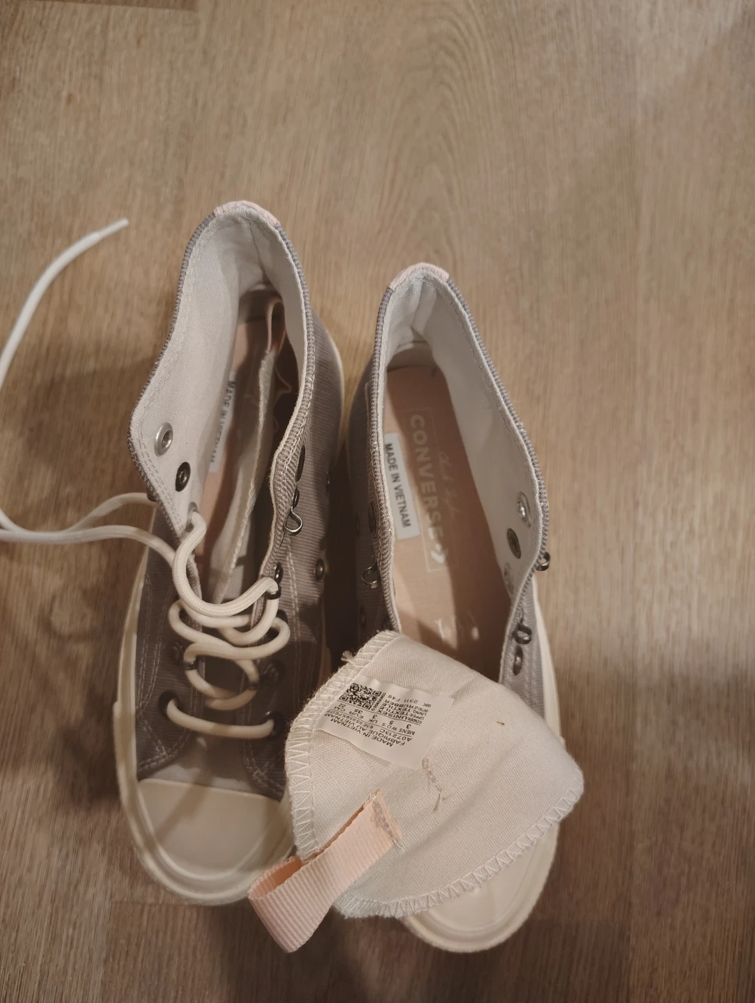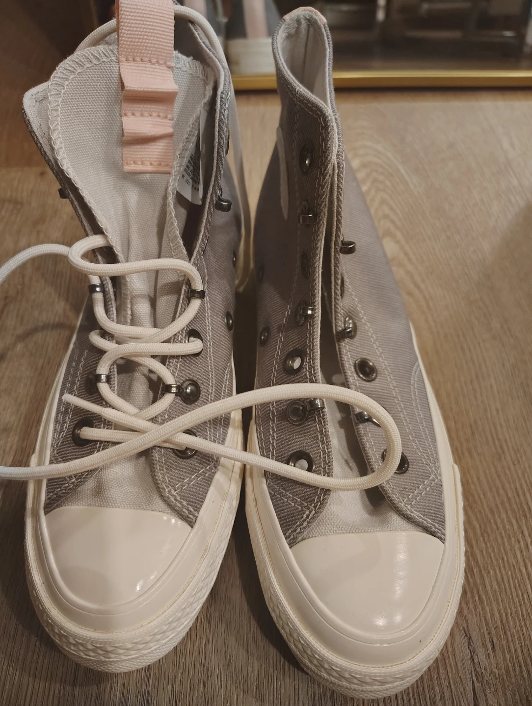 Classic high-top Converse Chuck Taylors in a neutral grey canvas with pink accents. Features the iconic Chuck Taylor ankle patch and durable rubber sole. These sneakers are a versatile addition to any wardrobe!
