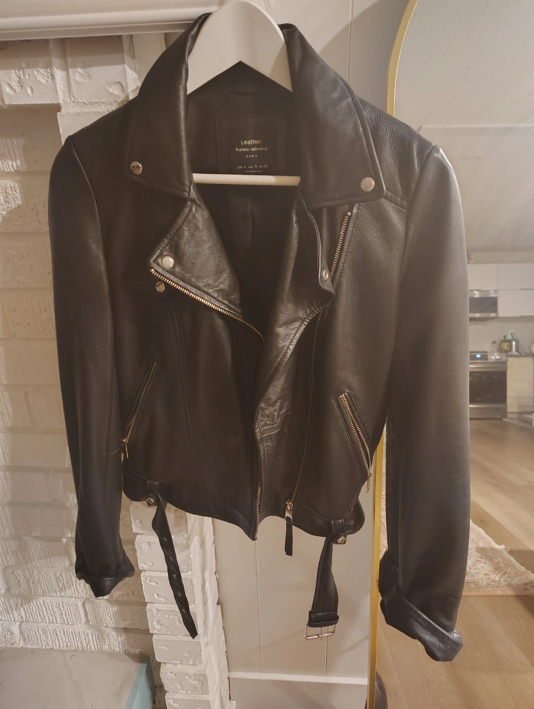 This is a ZARA leather biker jacket. It's black and made of leather. Features include metal zippers and a belted waist. Size is small.