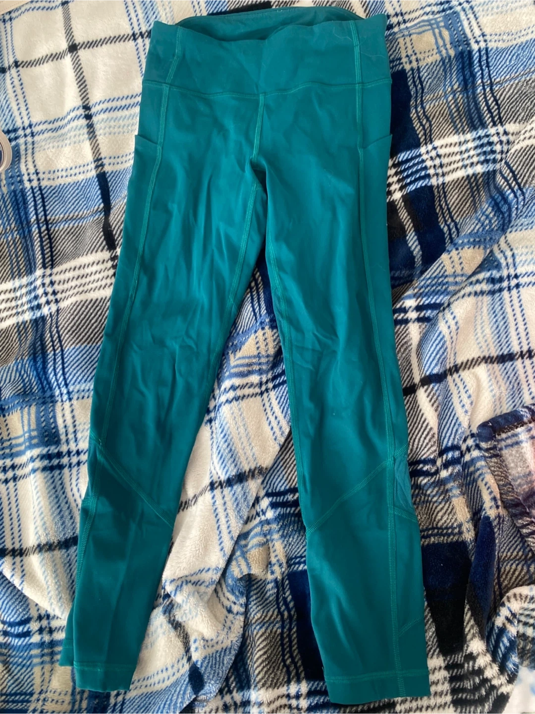 Teal capri leggings with side pockets. They're a mid-rise style. Perfect for workouts or casual wear! Pick up cash only