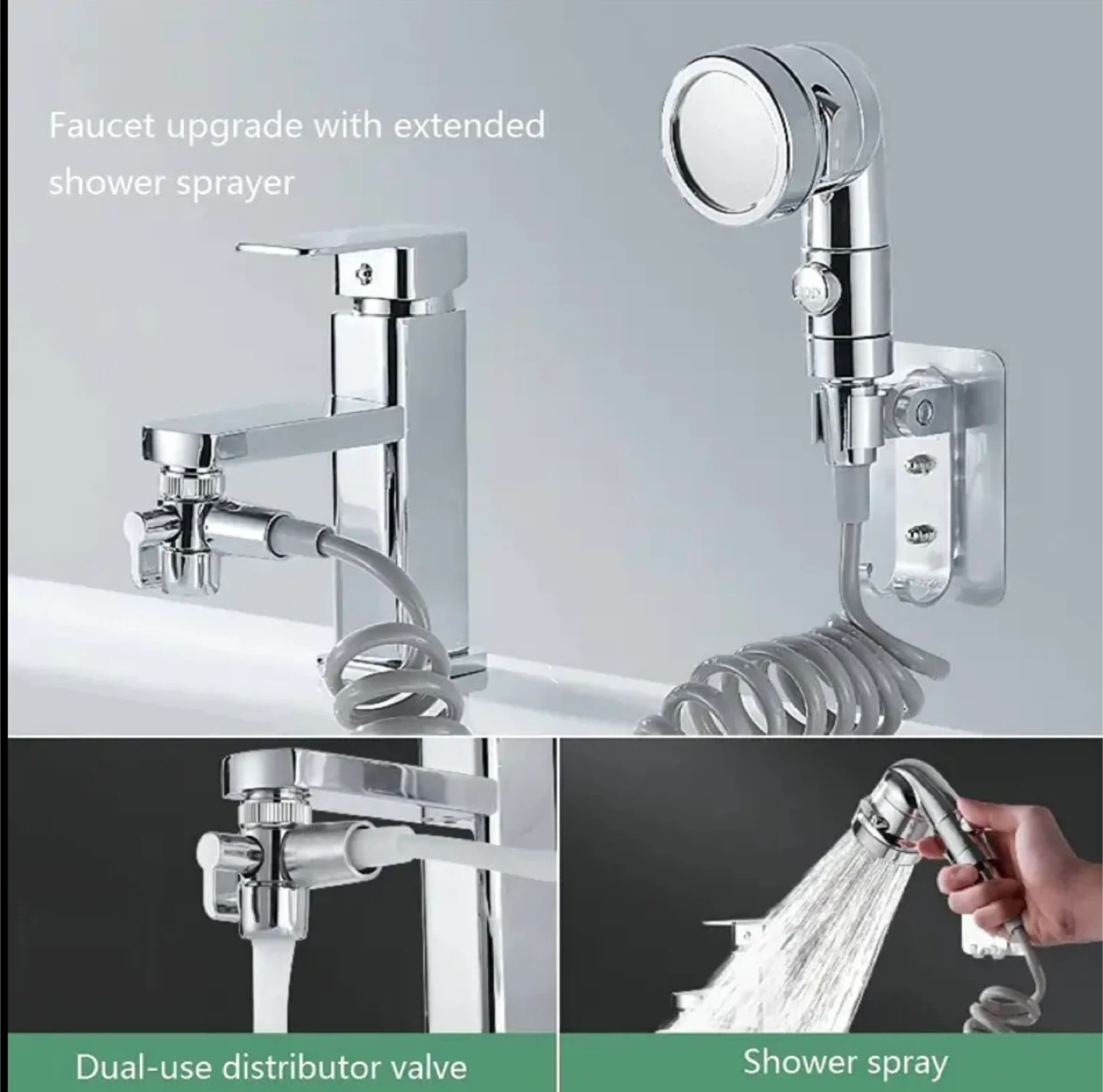 Can use the sink faucet + the shower head at the same time with the attachment included in the set!