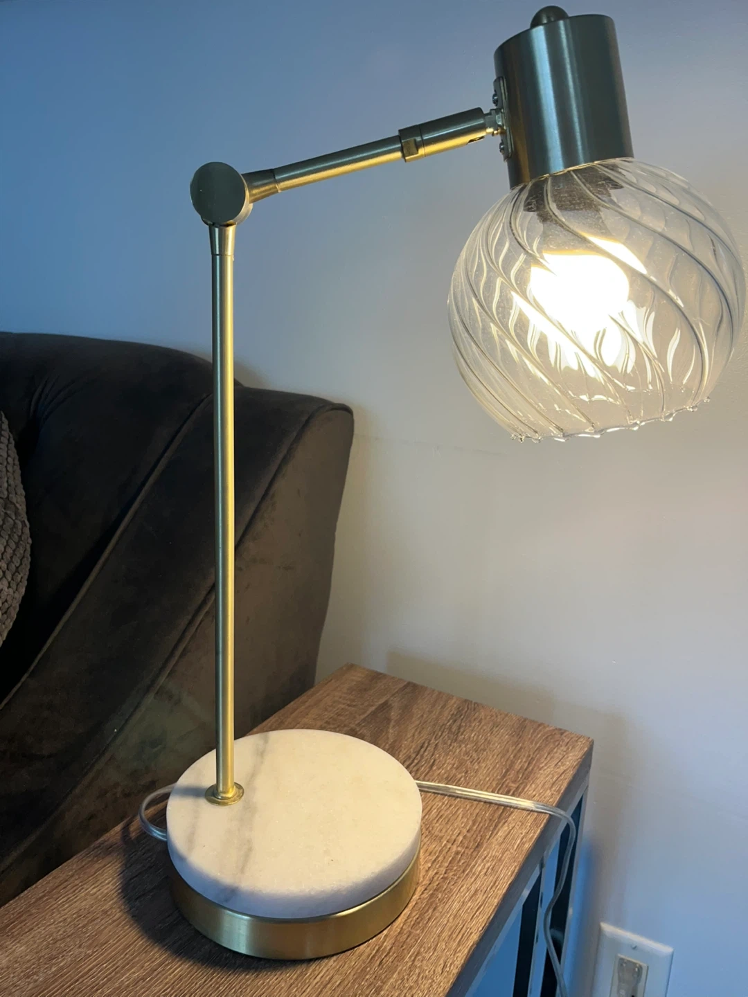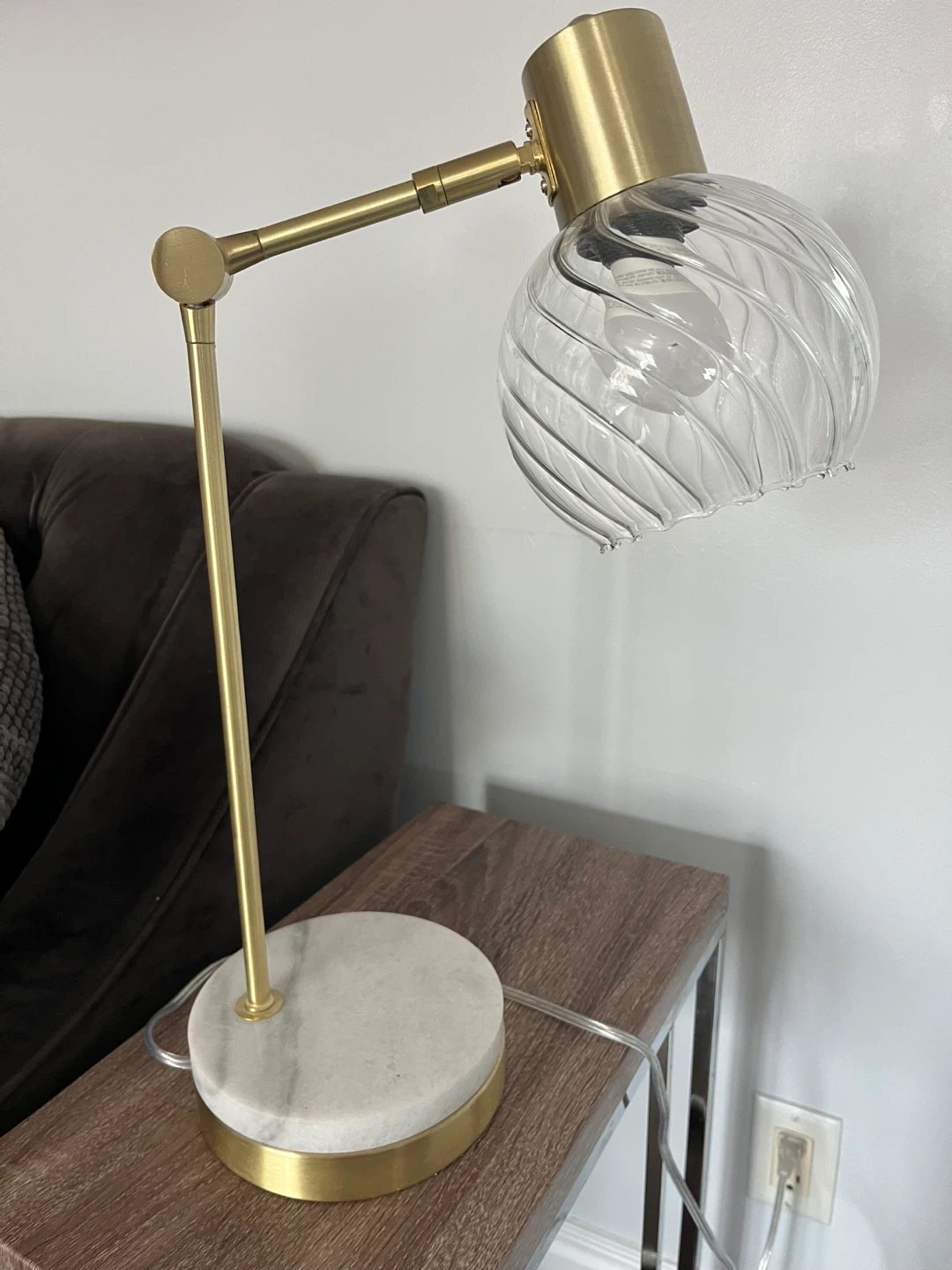 This stylish desk lamp features a rotating arm and a clear glass shade with a unique swirl pattern. It has a sturdy marble base and a brushed gold finish. It's perfect for adding a touch of modern elegance and functional lighting to any workspace or bedside table.