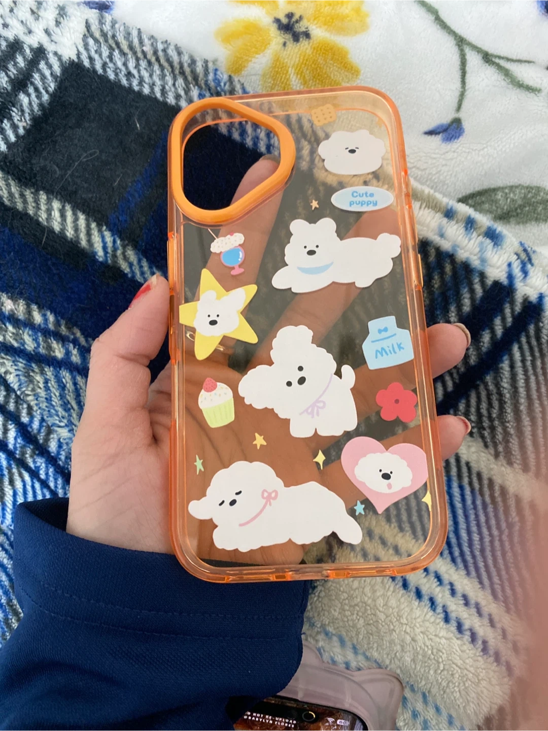 This clear phone case features adorable white puppies and stars. It has an orange trim and offers protection with a fun design. The case is made of a durable, clear material. Pick up cash only