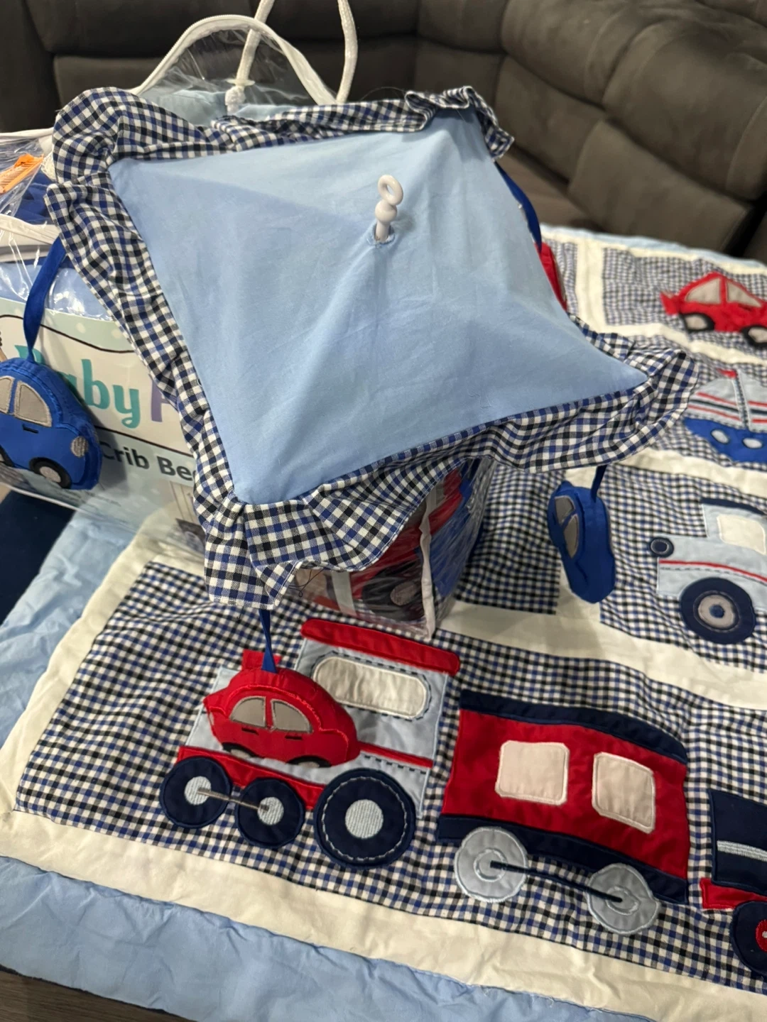 This cute crib bedding set features a fun patchwork design with various vehicles like trains, cars, trucks, and a boat. It's made with a blue and white gingham pattern. Perfect for a nursery!