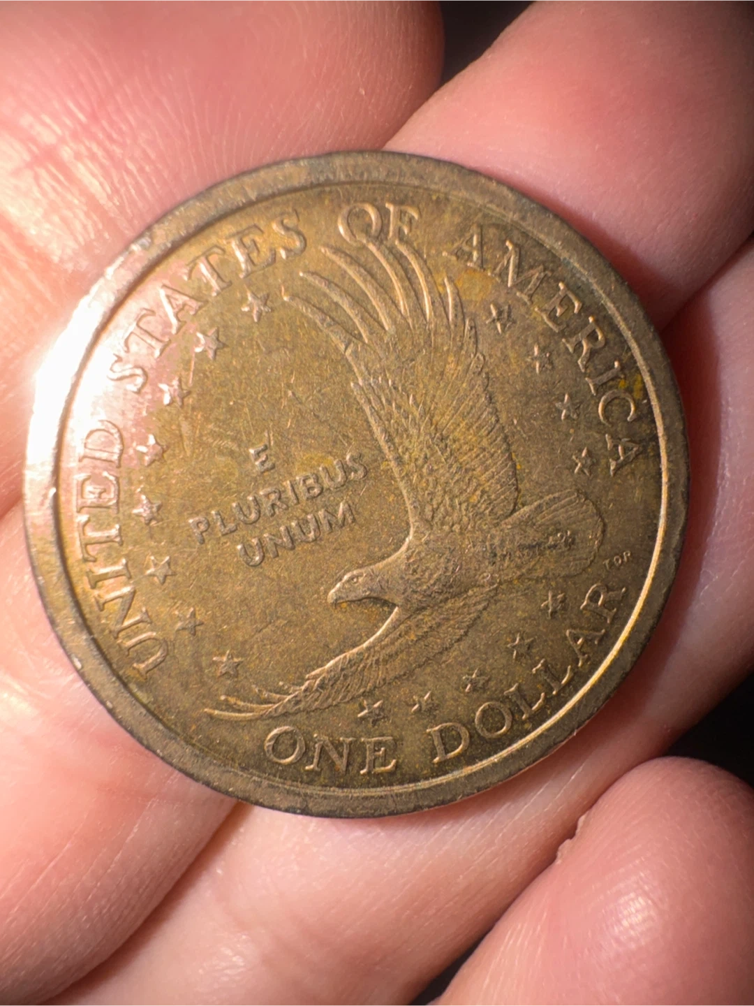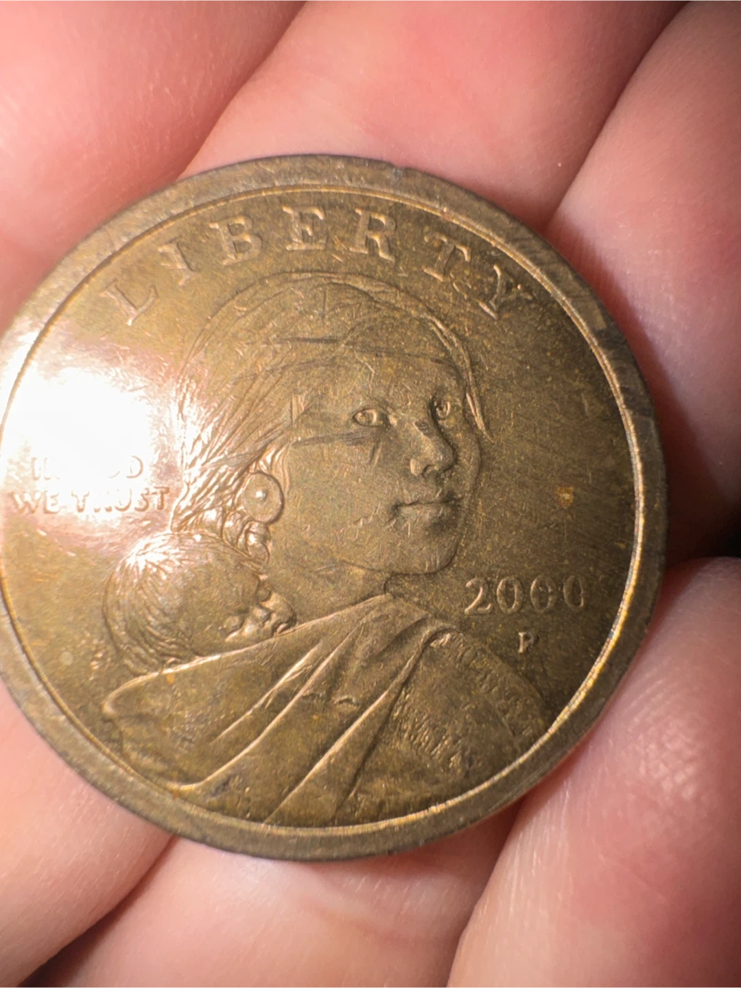 This is a "Sacagawea" dollar coin from the United States, minted in 2000. The coin features an eagle on one side and Sacagawea with her baby on the other. It's a standard one-dollar coin.