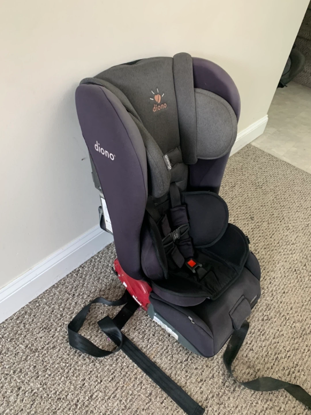 This is a Diono car seat in grey. It has a 5-point harness system and adjustable headrest. This seat is suitable for children from infancy up to booster age.