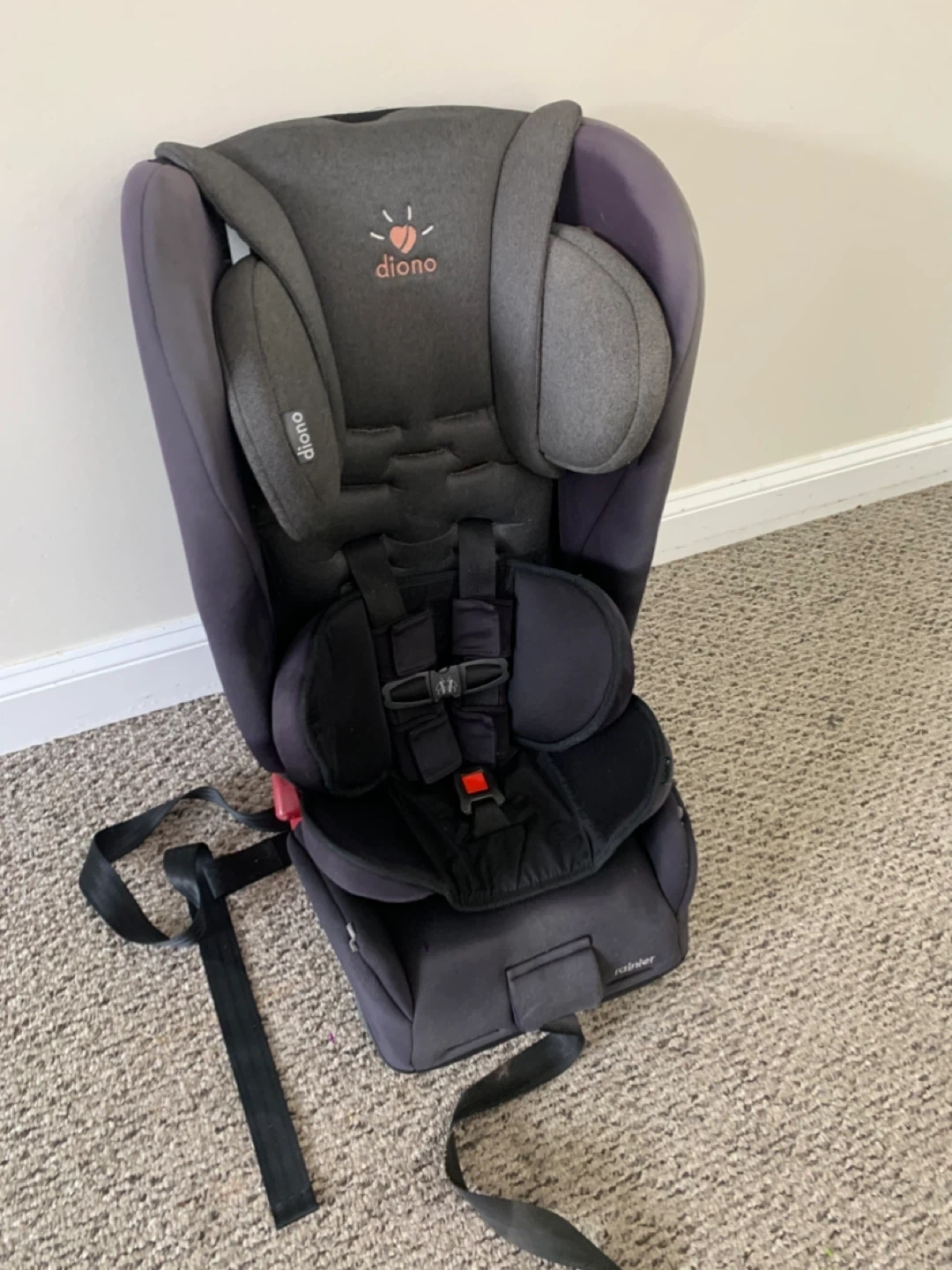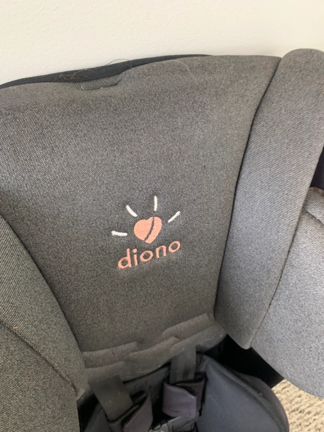 This is a Diono car seat in grey. It has a 5-point harness system and adjustable headrest. This seat is suitable for children from infancy up to booster age.