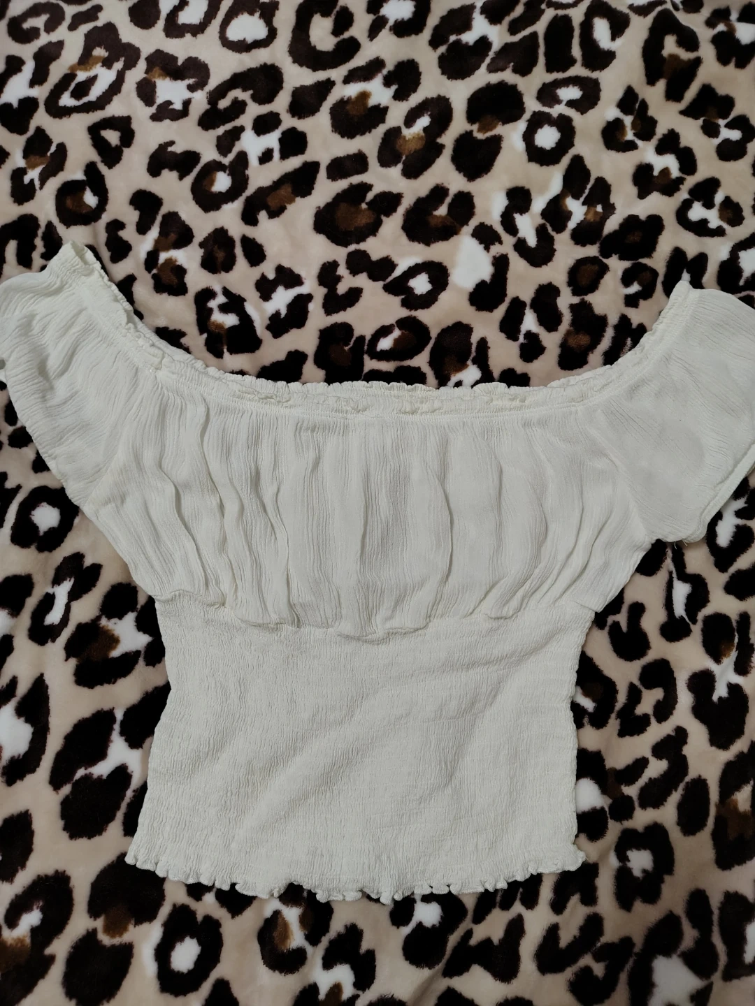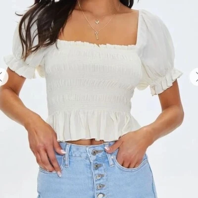 This cream-coloured top has a smocked bodice and puff sleeves. It features a square neckline and a ruffled hem. The fabric is lightweight and textured. Thinner fabric so definitely need something underneath but it's perfect for spring! Size small, can stretch to a medium