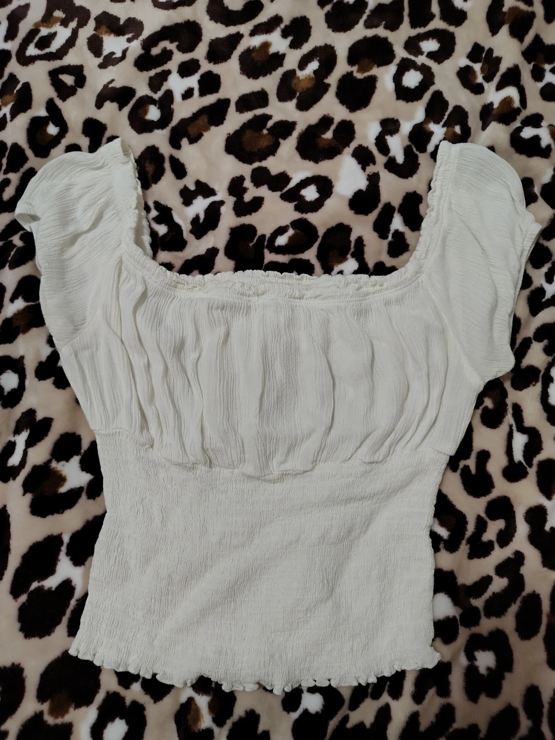 This cream-coloured top has a smocked bodice and puff sleeves. It features a square neckline and a ruffled hem. The fabric is lightweight and textured. Thinner fabric so definitely need something underneath but it's perfect for spring! Size small, can stretch to a medium