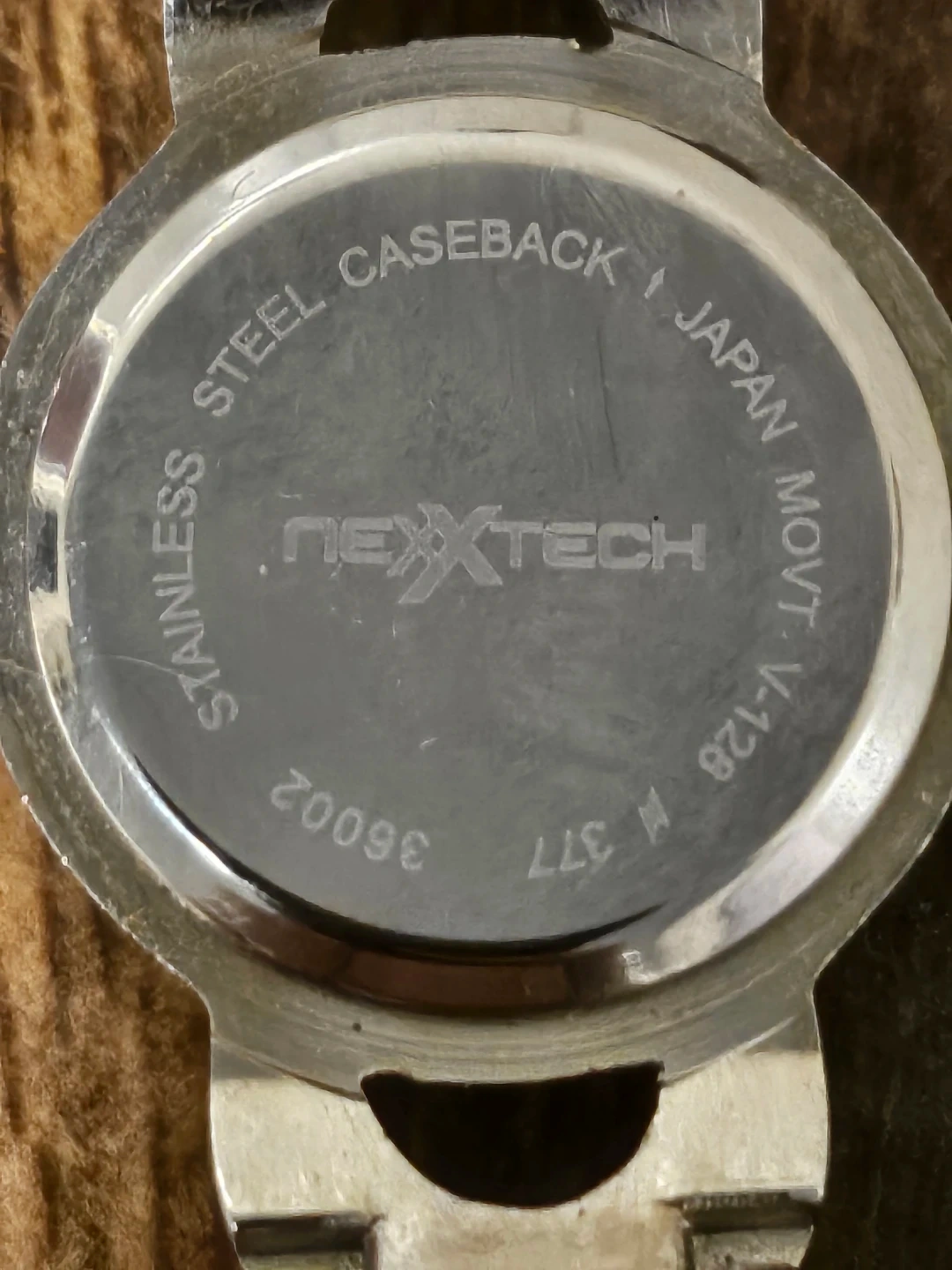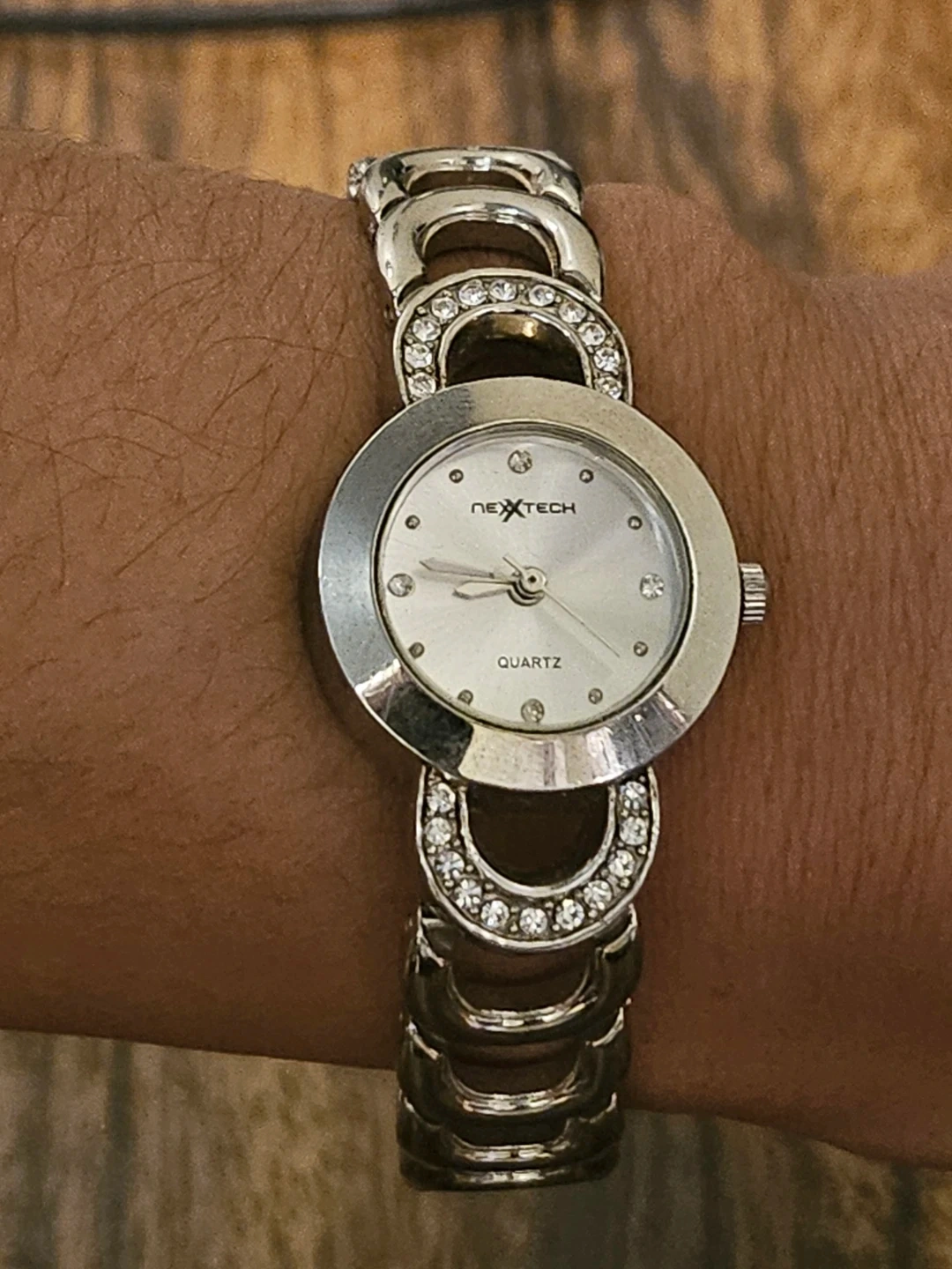 Nextech ladies quartz watch with a silver-tone metal band adorned with small rhinestones. It features a round, silver-coloured face with a crystal accent at each hour marker. The caseback is stainless steel with Japan movt.