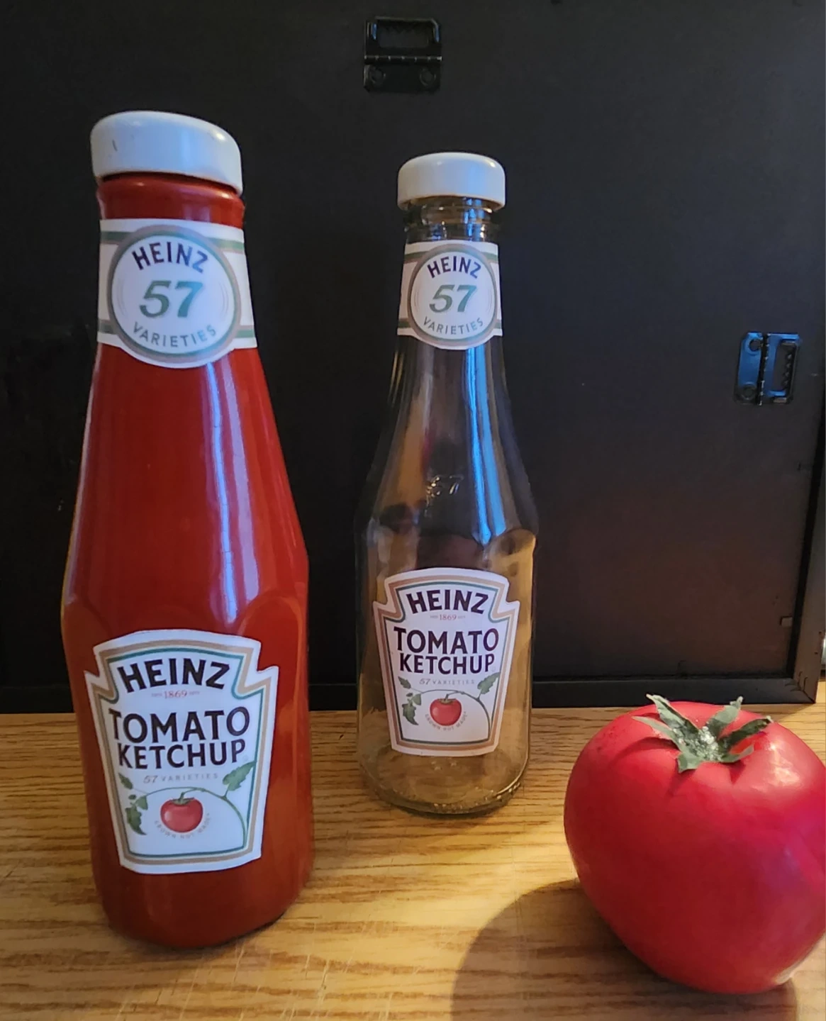In perfectly shape. Comes with a real glass bottle and fake tomato for other routines. Extra labels for sale.