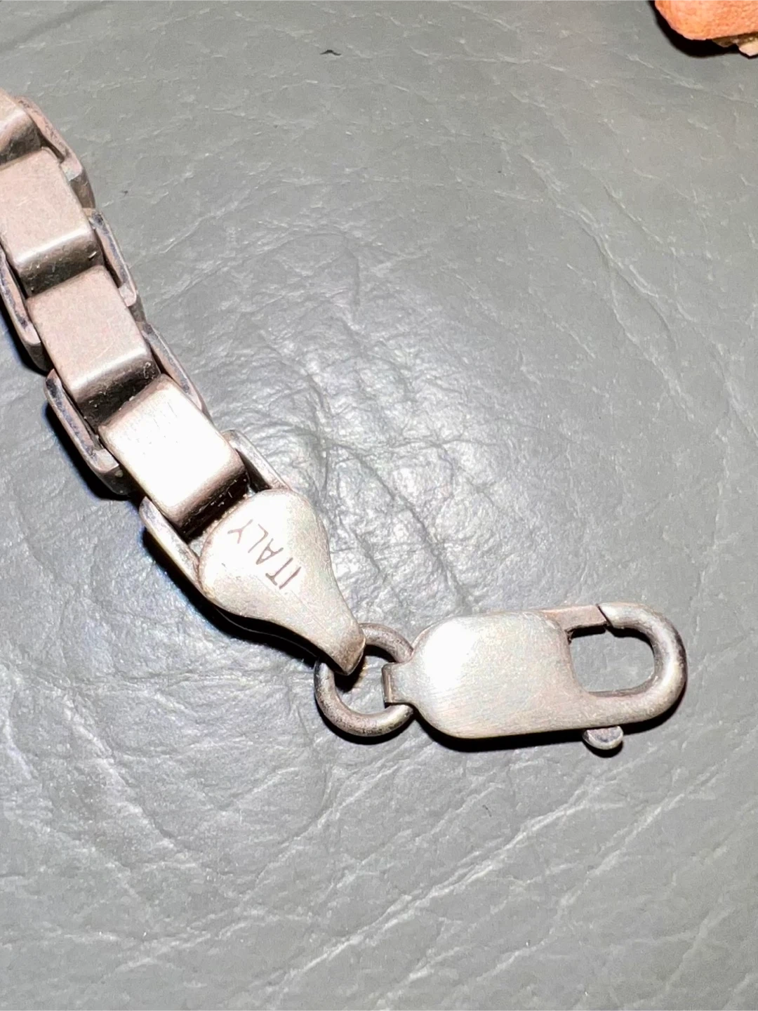 A stylish chain necklace marked "925" and "ITALY". It's made of sterling silver with a box link design. This necklace would be a great addition to any jewellery collection!