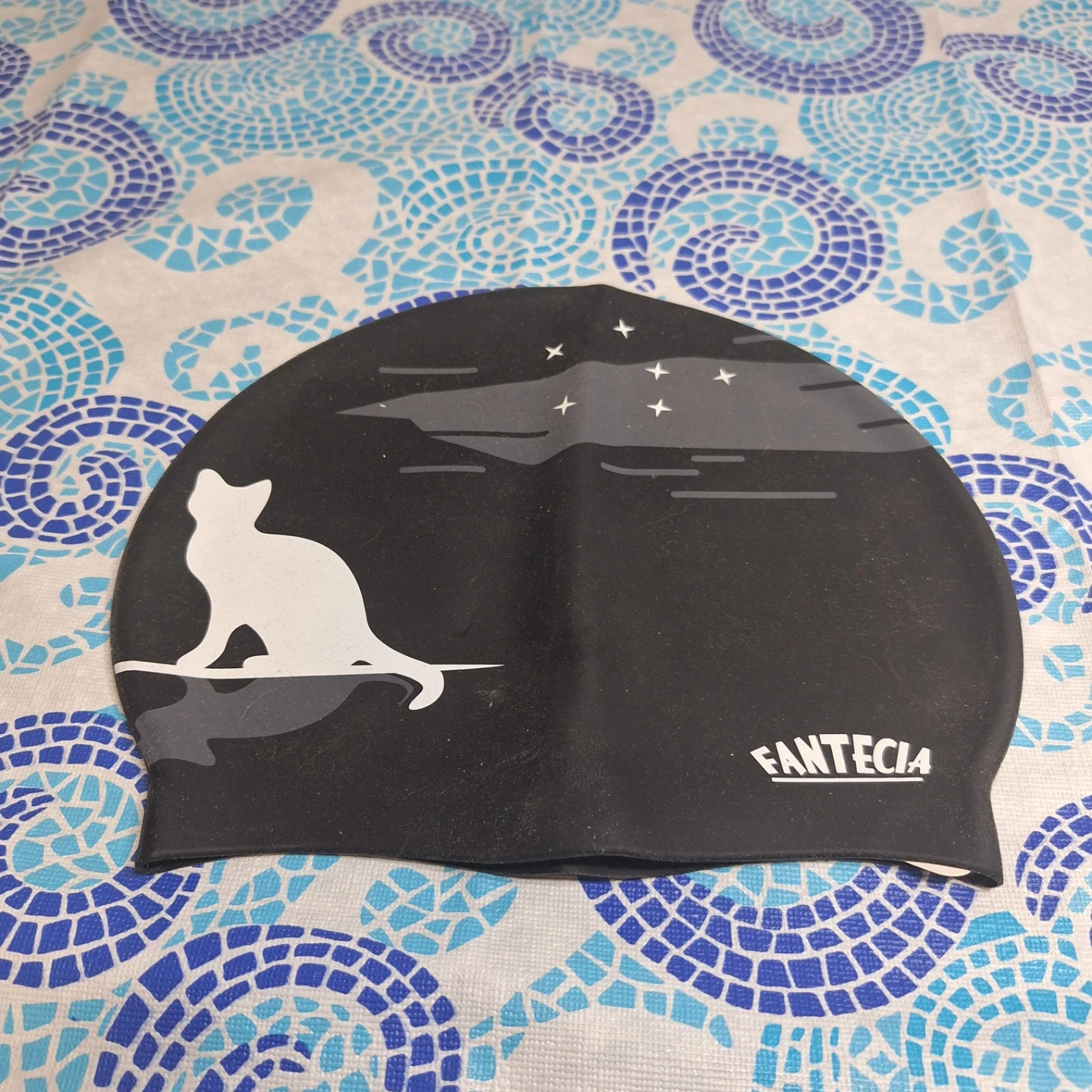This FANTECIA silicone swim cap is black with a white cat and stars design. It's made of durable silicone for a comfortable fit. Protects hair from chlorine and waves. Easy to put on and take off!