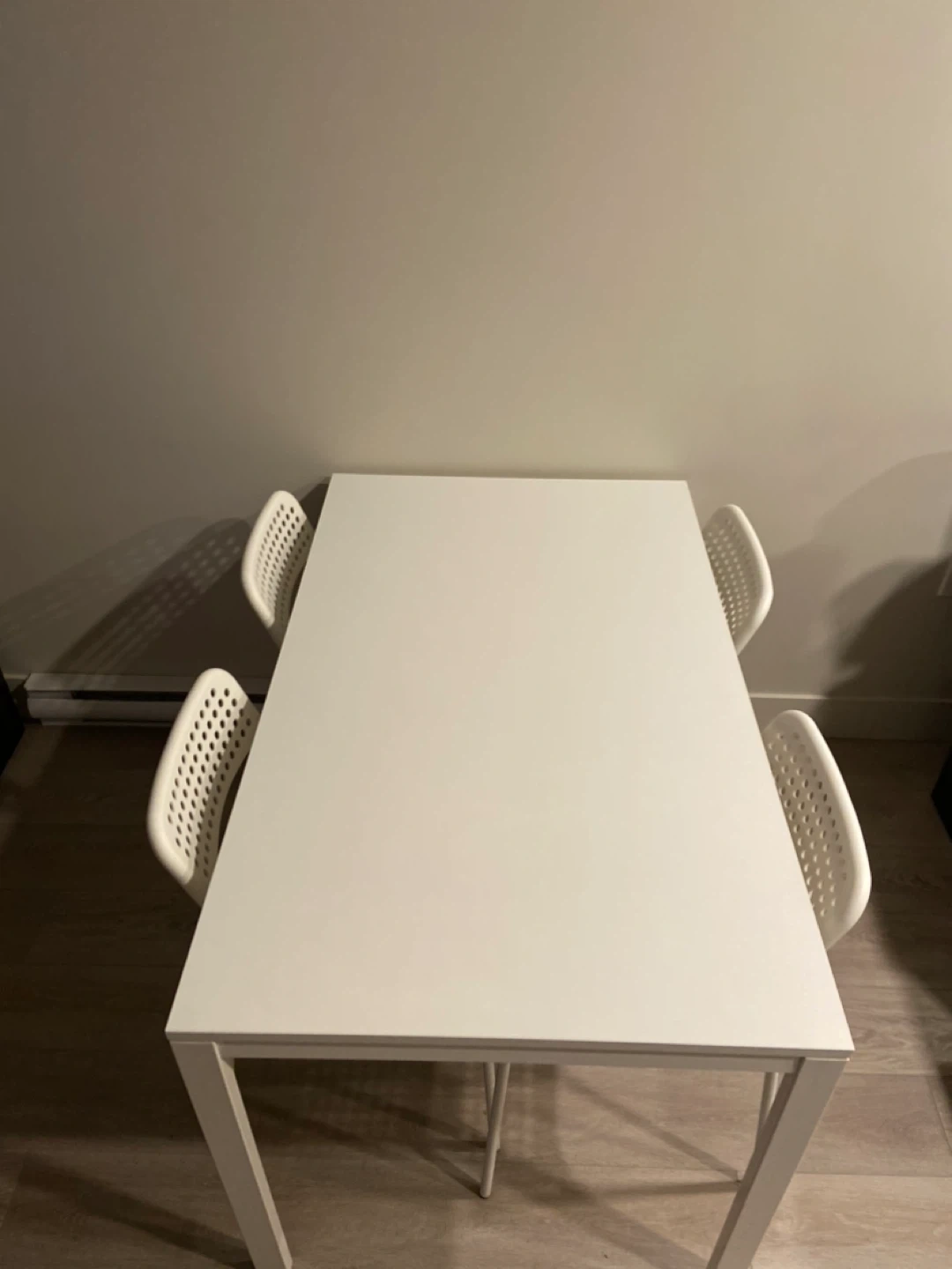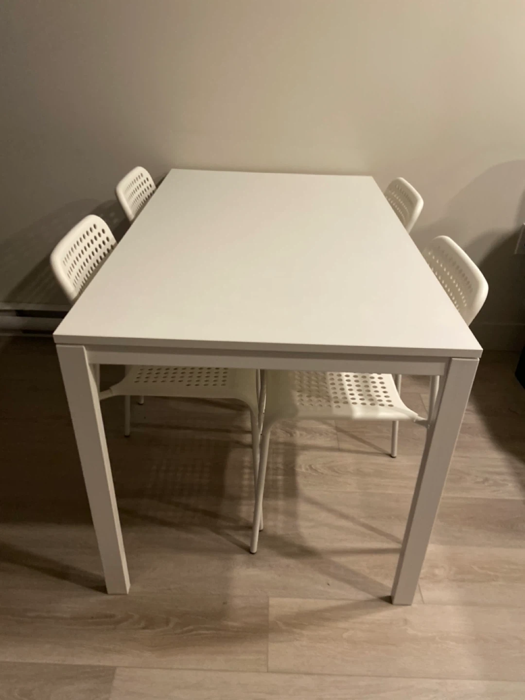 This is a white IKEA dining table with four matching chairs. The table has a metal frame and a smooth white top. The chairs are also white with a perforated seat and back. It's a simple, modern set for any dining area.