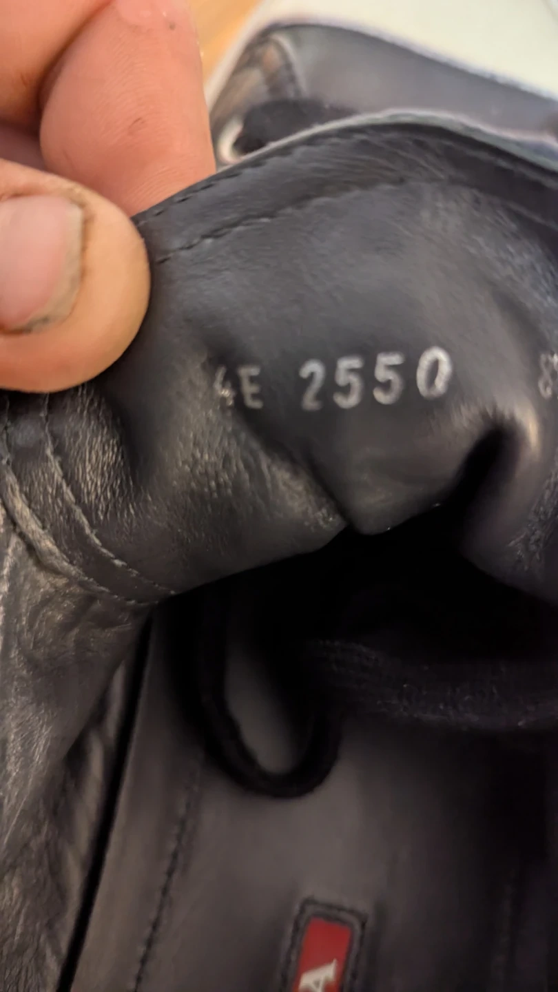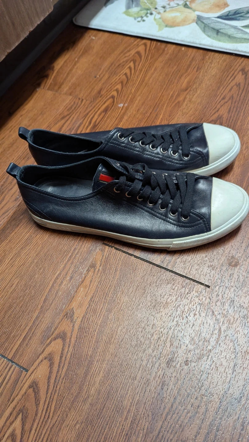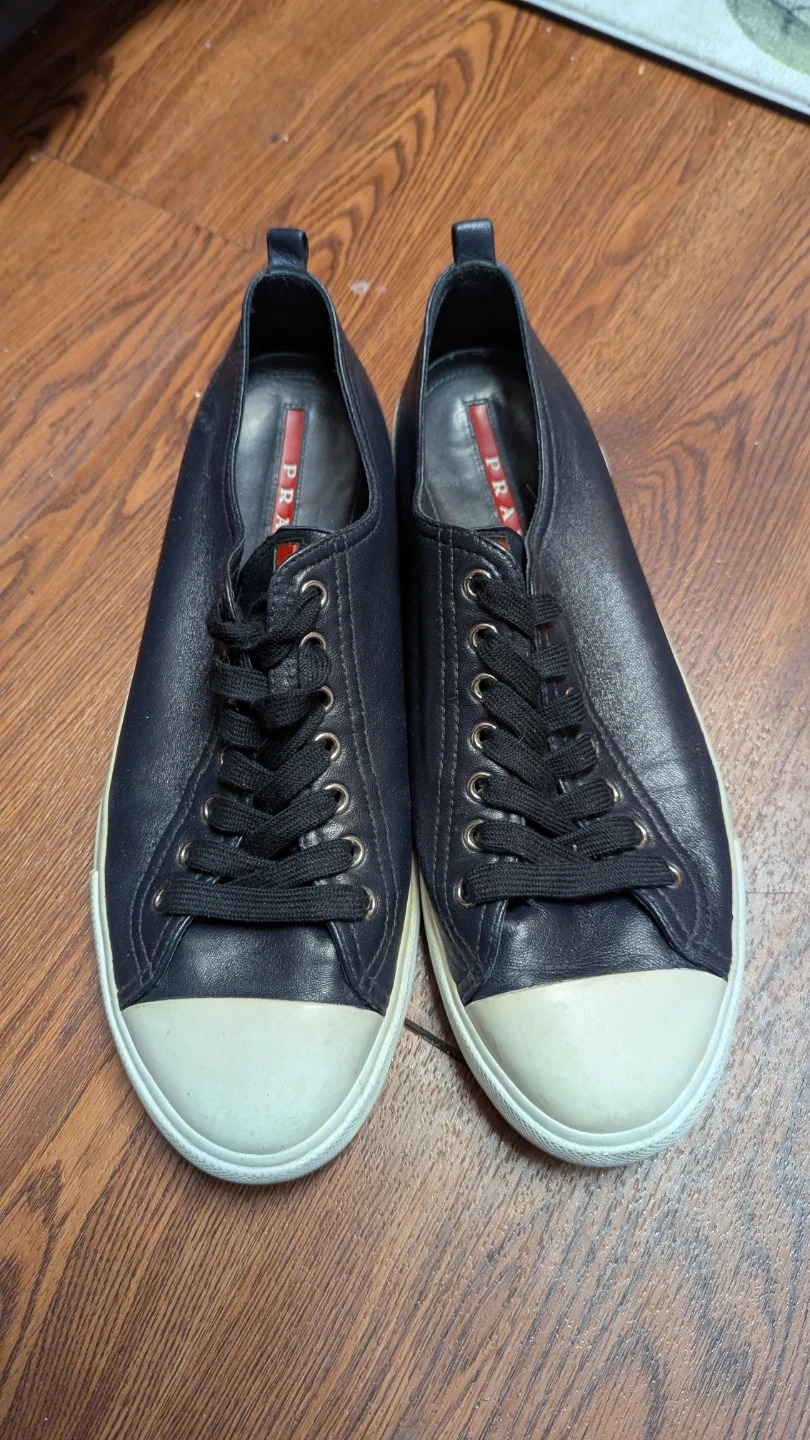 These are Prada black leather sneakers with white soles. They feature laces and the iconic Prada logo detail. Great for everyday wear!