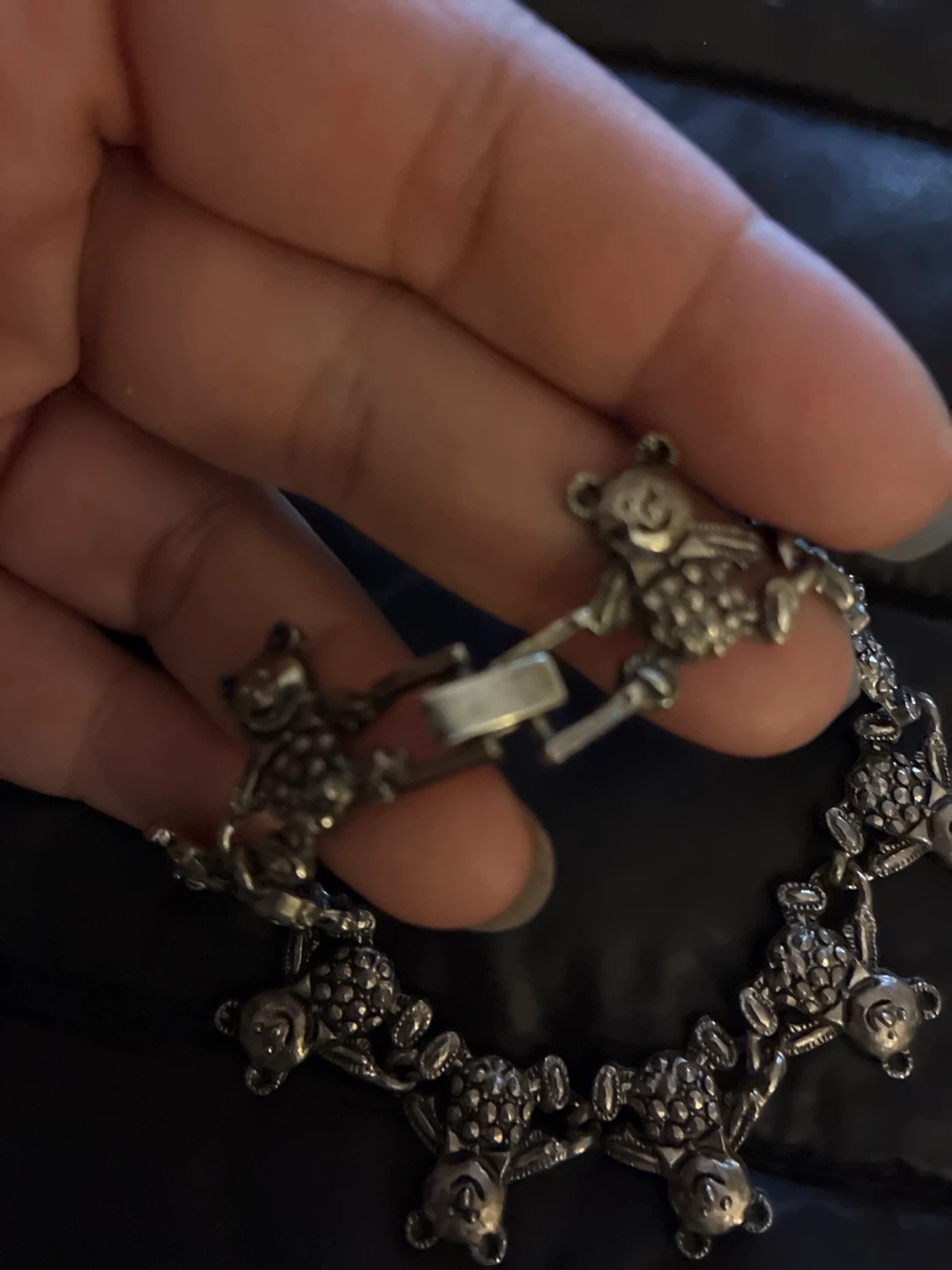 This charming bracelet features a series of adorable teddy bear charms linked together. It has a secure clasp closure. Silver-tone metal construction.