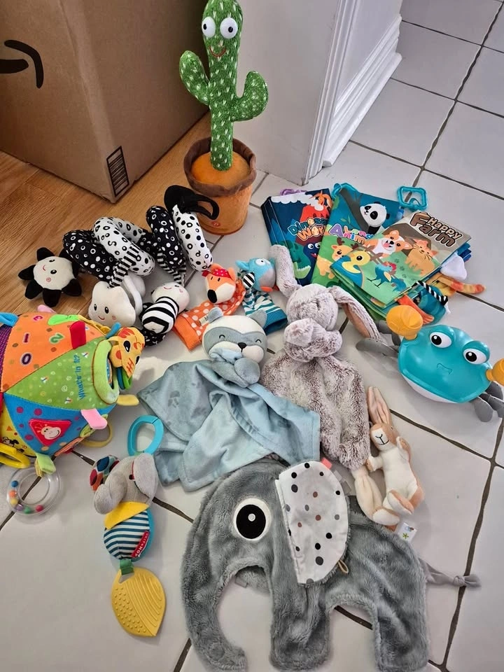 Large bundle of baby plush toys, soft books, and activity toys. Includes comfort loveys, black-and-white sensory plush for a stroller or car seat, soft fabric books, foot finders, an activity ball, a dancing cactus, and a crawling crab. From a clean, pet-free and smoke-free home. Pickup preferred near Brock University. Only selling as a lot. If it's listed, it's available. Cash or etransfer.