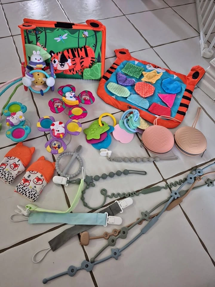 Large lot of modern silicone teethers and sensory toys. Includes pacifier and stroller clips, spinners, teething mits, activity boards for tummy time, and pacifier containers. From a clean, pet-free and smoke-free home. Great for teething, sensory play, and early development. Pickup preferred (near Brock University). Only selling as a lot. If it's listed, it's available. Cash or etransfer.