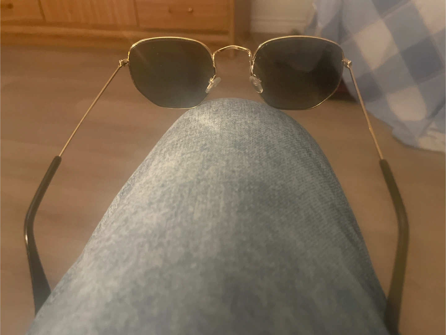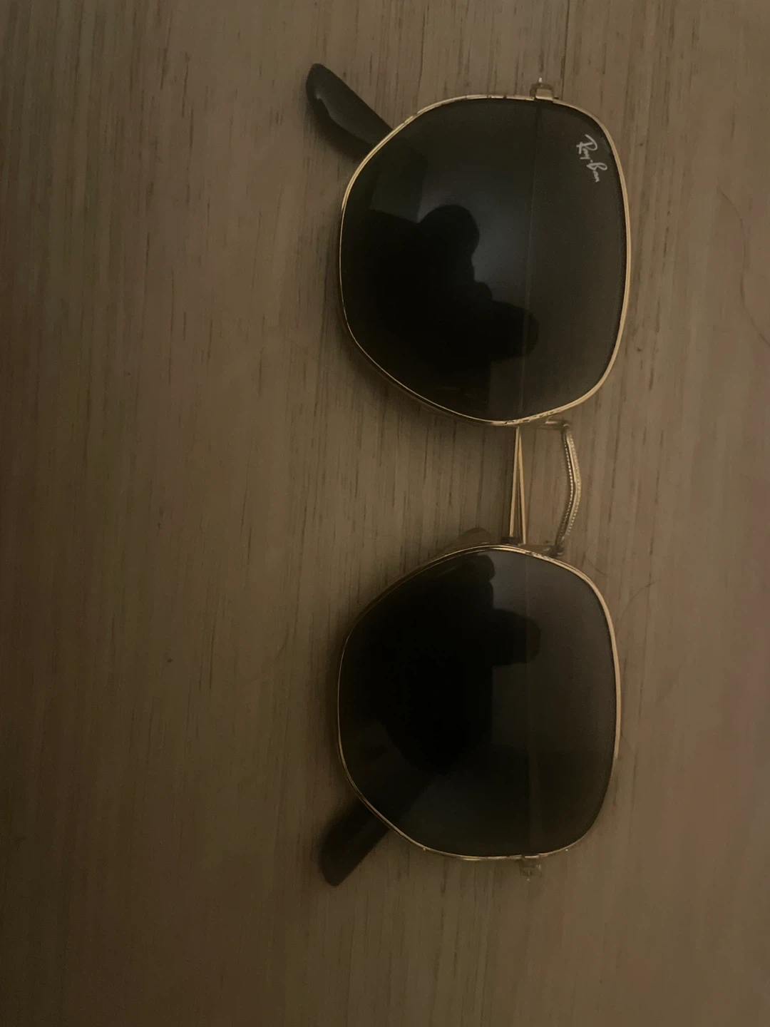 Ray-Ban sunglasses with a gold frame and dark lenses. These shades offer classic style and sun protection. Perfect for sunny days!