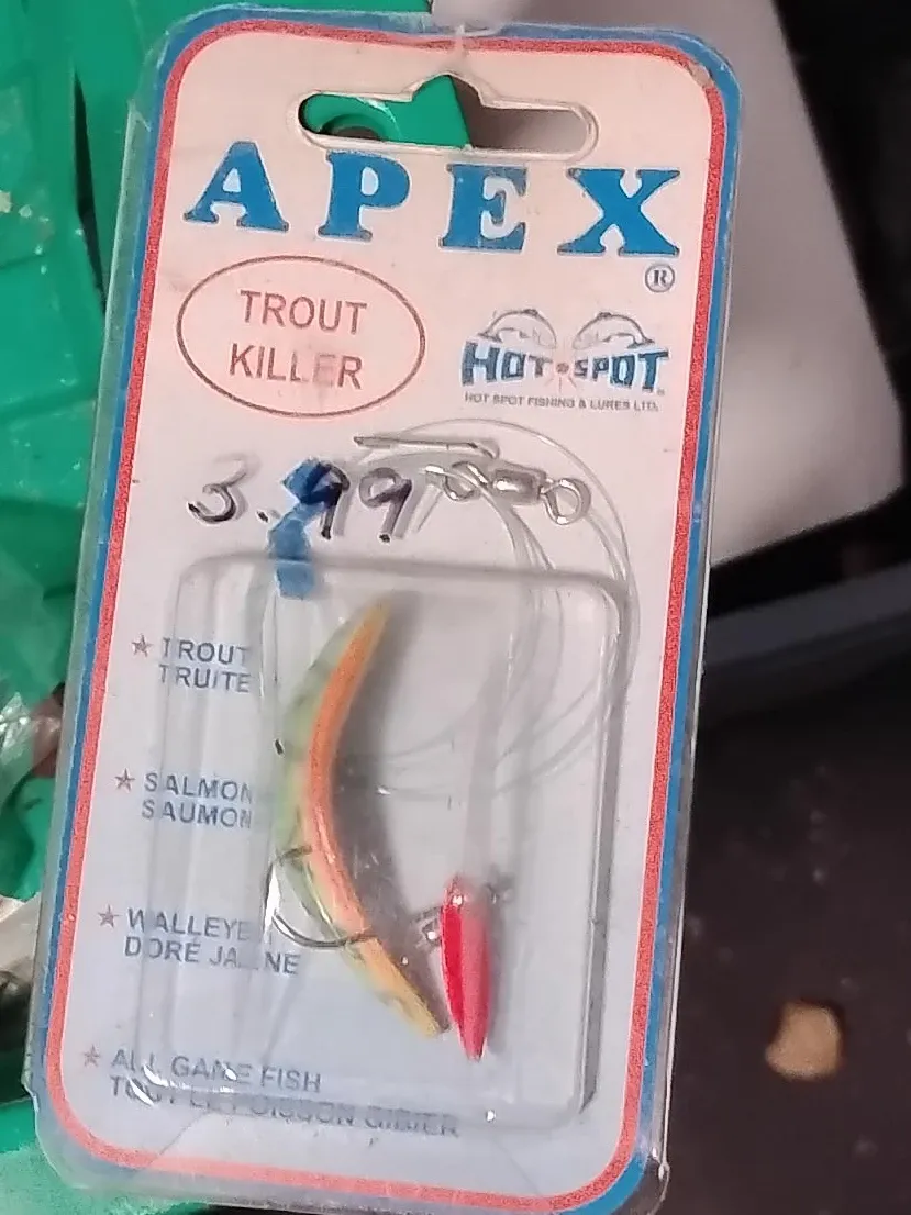 This is an Apex "Trout Killer" fishing lure. It's designed for trout, salmon, walleye, and all game fish. The packaging indicates it's from Hot Spot Fishing & Lures Ltd. This lure is great for a day out on the water!
