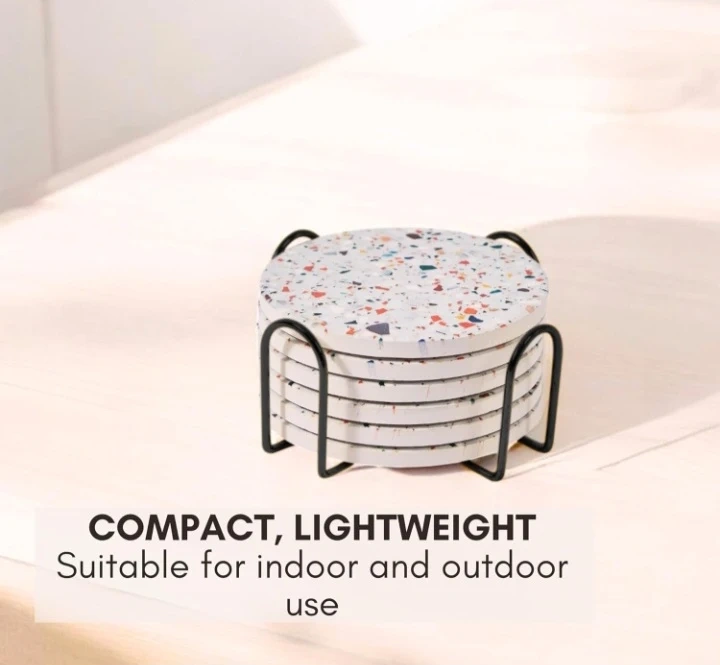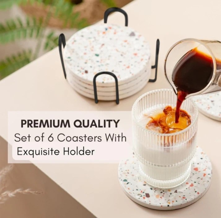 Protect your tables with this set of six absorbent ceramic coasters featuring a unique terrazzo design. It's moisture-absorbing and comes with a stylish black holder. They're great for preventing condensation rings from cold drinks and heat stains from hot beverages!