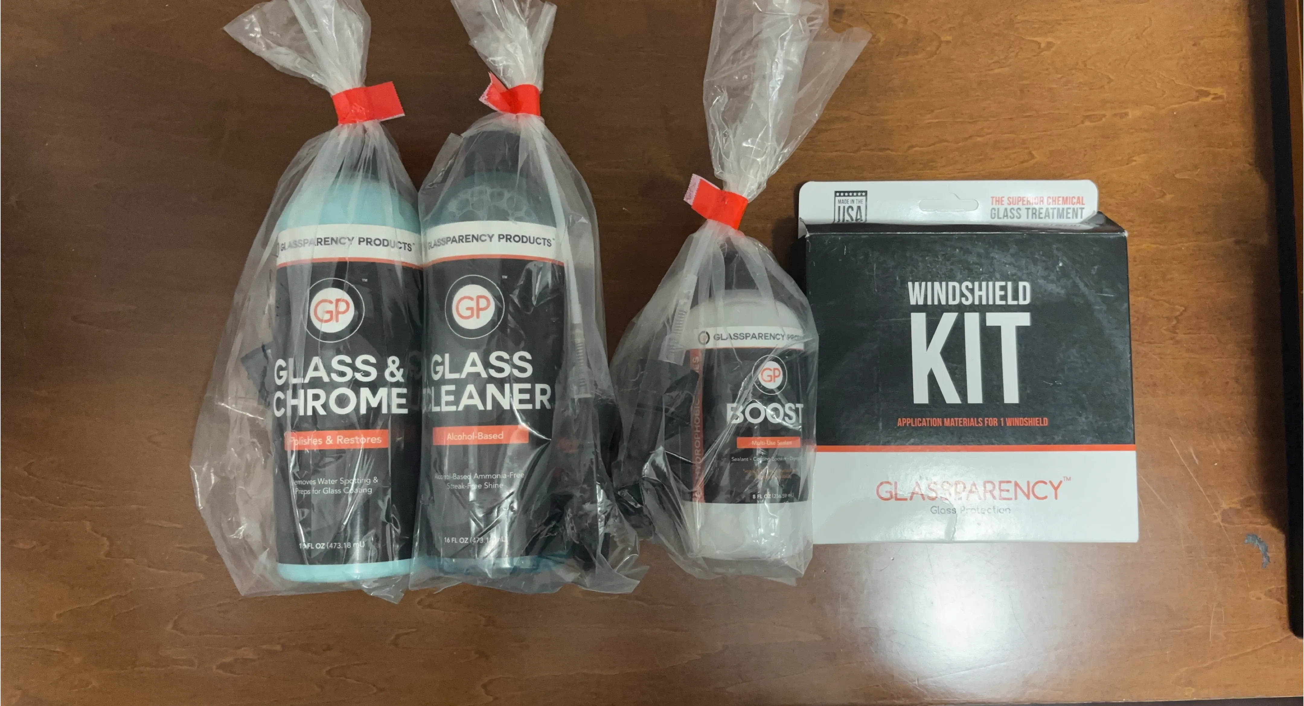 This is a Glassparency windshield kit. It includes a Glass & Chrome cleaner, a Glass cleaner, a Boost multi-use sealant, and a 2-step glass application package with cream cleanser and with 4 applicator pads. Great for rainy commutes, clear visibility, rain slides off in beads, easy application. Products are made in the USA.
