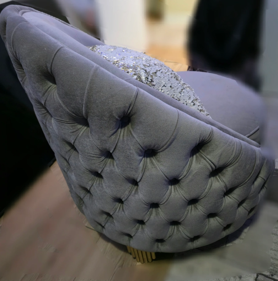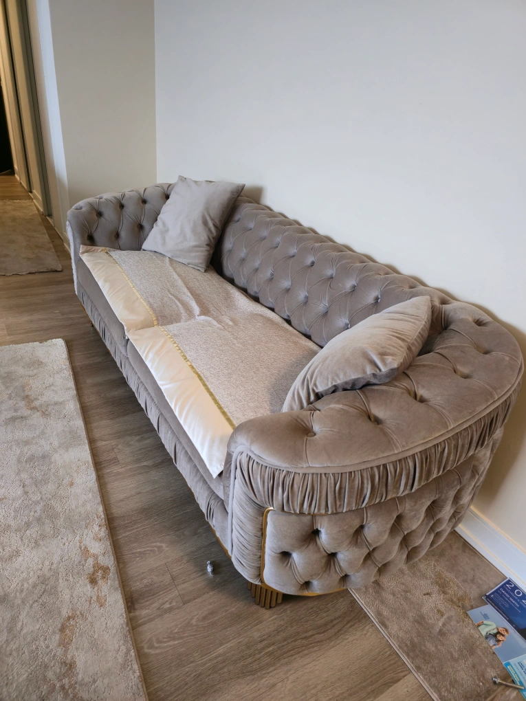 Stylish 3-piece Turkish loveseat upholstered in soft grey velvet. It features elegant gold trim and unique gold-plated legs. This piece adds a touch of glamour to any living space.