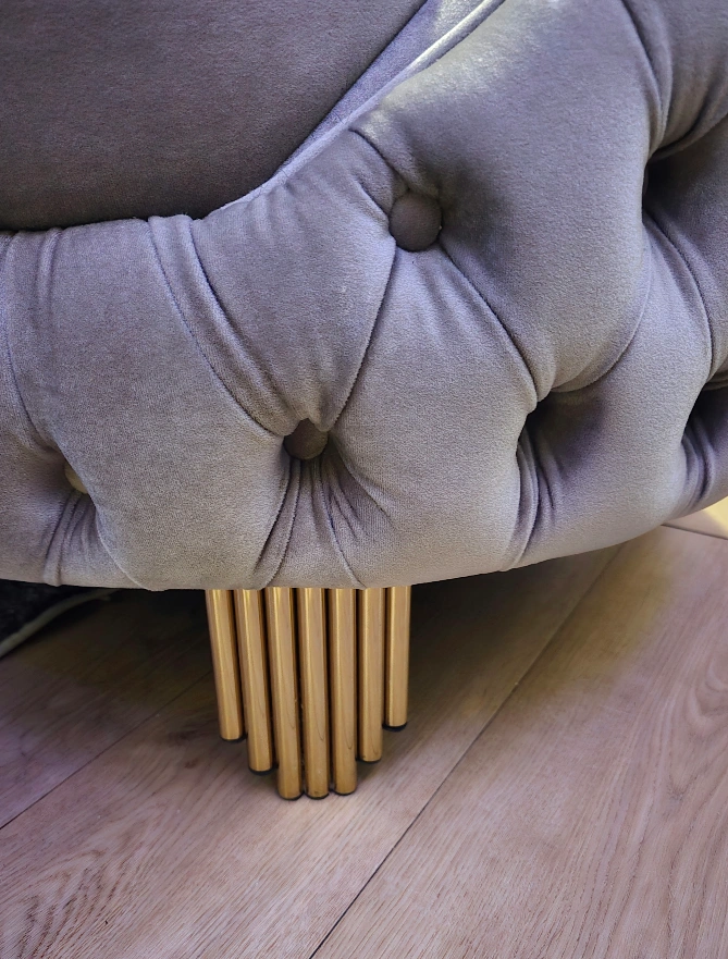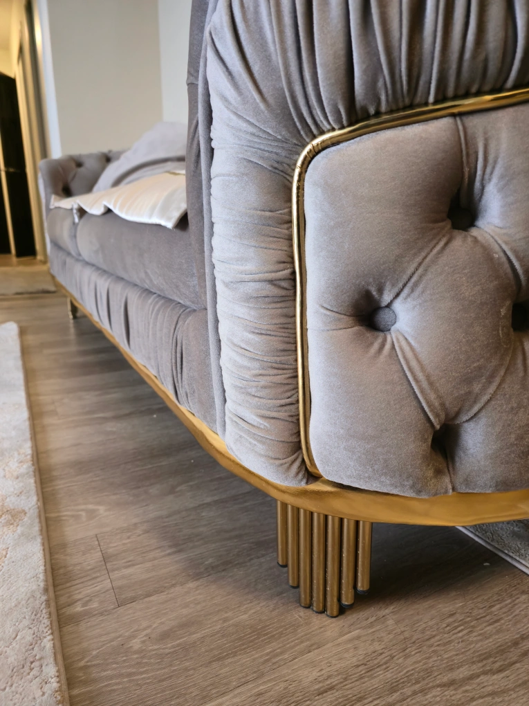 Stylish 3-piece Turkish loveseat upholstered in soft grey velvet. It features elegant gold trim and unique gold-plated legs. This piece adds a touch of glamour to any living space.