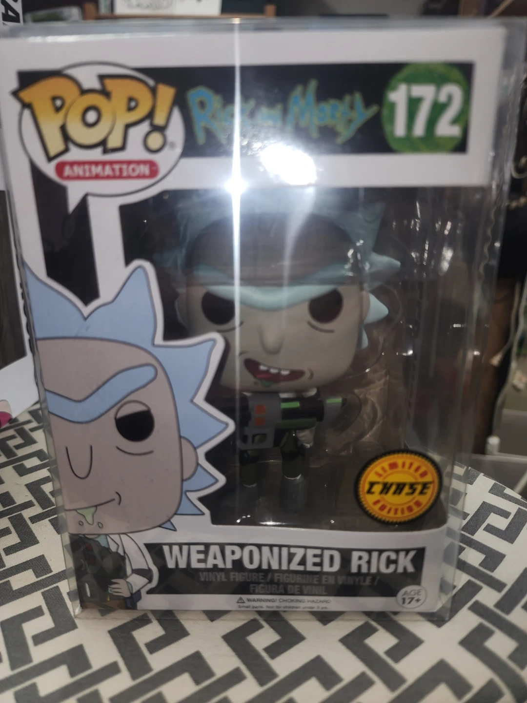 This is a Funko Pop! Animation figure of Weaponized Rick from Rick and Morty, model #172. It's a limited Chase Edition figure. The vinyl figure is recommended for ages 17 and up.
